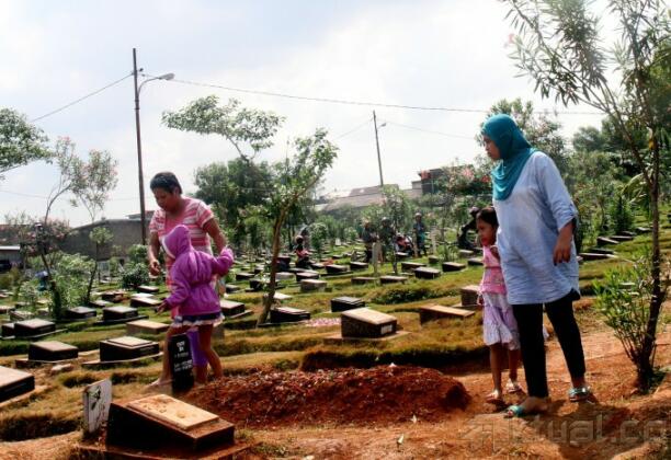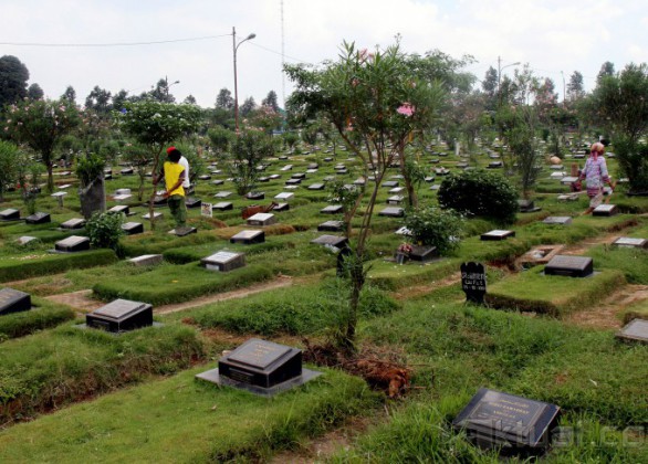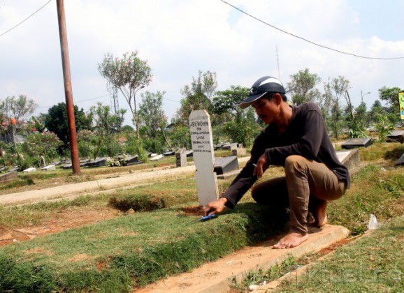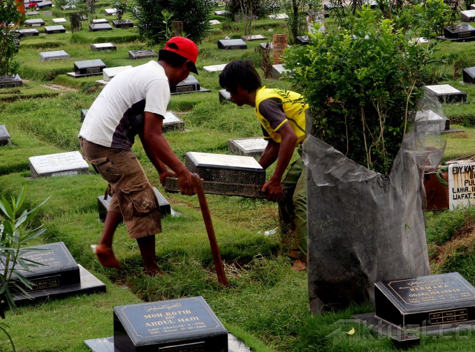 Seorang petugas membersihakan sebuah makam yang berada di Tempat Pemakaman Umum (TPU) Malaka, Pondok Kelapa, Jakarta Timur, Rabu (1/4/2015). Untuk mencegah pungutan liar (Pungli) Kepala Dinas Taman dan Pemakaman Pemrov DKI Jakarta, Andar, berjanji akan memakai sistem pendaftaran elektronik yang online. Kadis Taman dan Pemakaman Pemrov DKI Jakarta berjanji sistem pendaftaran untuk pemakaman secara online bisa terealisasi dalam waktu tiga bulan. AKTUAL/MUNZIR