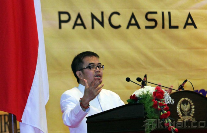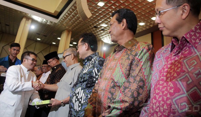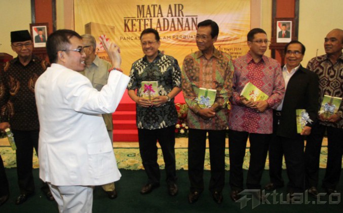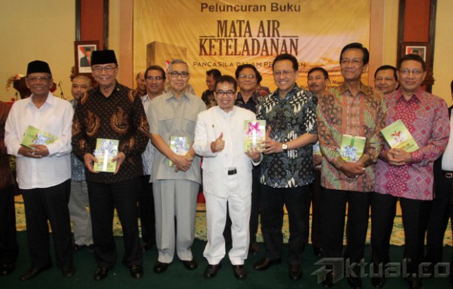 Sejumlah tokoh seperti Wakil Gubernur Jawa Barat, Dedi Mizwar, MPR Sidarto Danusubroto, Ketua DPD, Irman Gusman, Gubernur DIY Sri Sultan Hamengkubuwono, tokoh NU, Hasyim Muzadi, tokoh Muhammadiyah, Dien Syamsudin, dan mantan Wakil Presiden, Try Sutrisno, menghadiri peluncuran buku yang ditulis Direktur Eksekutif, Reform Institute Yudi Latif berjudul “Mata Air Keteladanan: Pancasila dalam Perbuatan”, di gedung Nusantara IV komplek Parlemen Senayan Jakarta Pusat, Jumat (21/3/2014). Buku ini merekam bagaimana nilai-nilai Pancasila dipraktikkan dalam keseharian perilaku para tokoh bangsa. Aktual/Tino Oktaviano