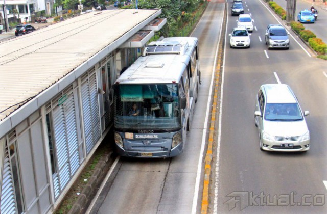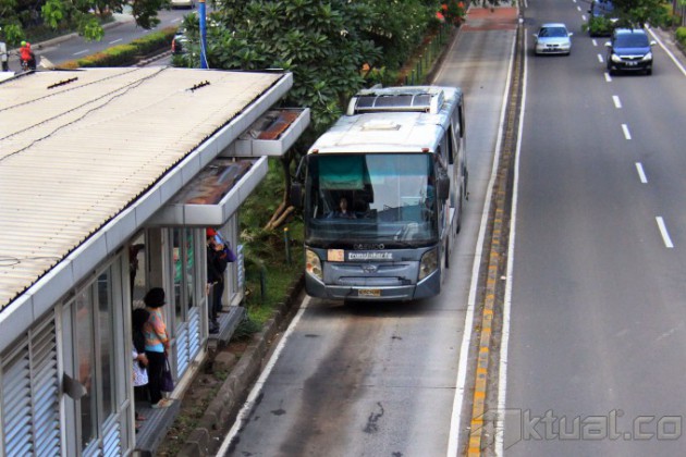 Bus transjakarta saat berhenti disebuah halte di Jalan HR Rasuna Said, Jakarta, Kamis (5/2/2015). Gubernur DKI Jakarta, Basuki Tjahaja Purnama memberikan sinyal positif apabila Transjakarta dikelola oleh pemerintah pusat. Hal tersebut justru lebih menguntungkan DKI karena PT Transjakarta merupakan saham Pemprov DKI. AKTUAL/MUNZIR
