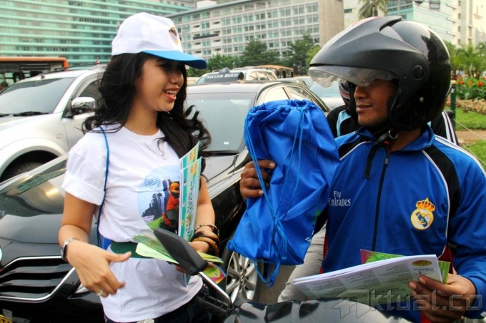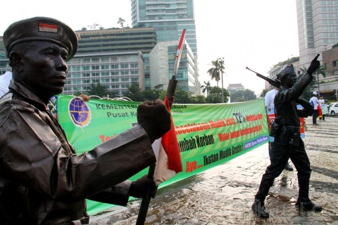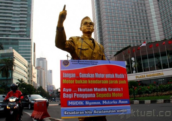 Seorang pantomin dengan menggunakan kostum pahlawan nasional ikut mengkampanyekan keselamatan berkendaraan saat mudik di Bunderan HI, Jakarta, Rabu (17/07). Aksi kampanye yang dilakukan oleh Kementrian Perhubungan ini mengajak kepada seluruh warga untuk menghindari mudik menggunakan sepeda motor, dan mengajak warga untuk mengikuti program mudik gratis dalam menekan angka kecelakaan yang terjadi di tahun 2012 sebanyak 5.233 kasus kecelakaan yang 72% melibatkan kendaraan motor. Aktual/Oke Dwi Atmaja