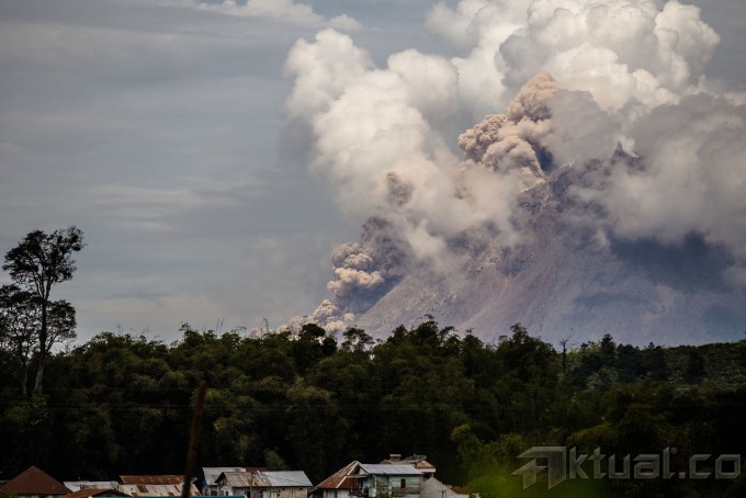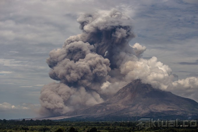 Gunung Sinabung mengeluarkan material vulkanik disertai awan panas, tampak dari Bukit Gundaling, Karo, Sumatera Utara, Rabu (1/4). Gunung Sinabung kembali meletus, dan sedikitnya tiga kali terjadi erupsi. ANTARA FOTO/Endro Lewa