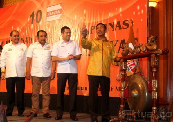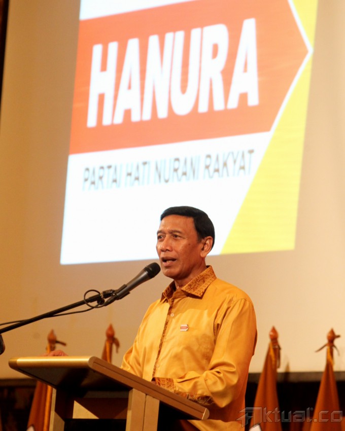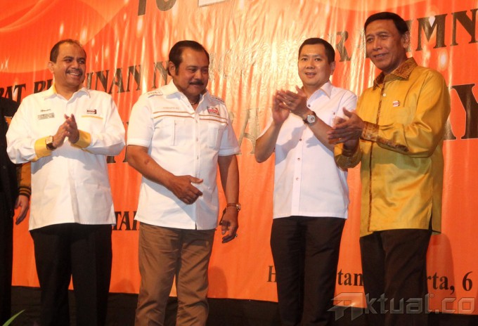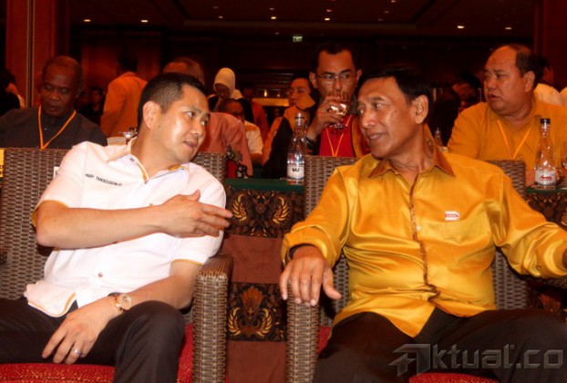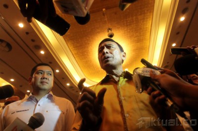 Ketua Umum Partai Hanura Wiranto (kanan) didampingi Ketua Bappilu Partai Hanura Hary Tanoesoedibjo (kiri), menjawab pertanyaan wartawan usai membuka Rapimnas I Partai Hanura di Jakarta, Selasa (6/5/22014). Rapimnas digelar untuk menentukan arah koalisi. Aktual/Tino Oktaviano