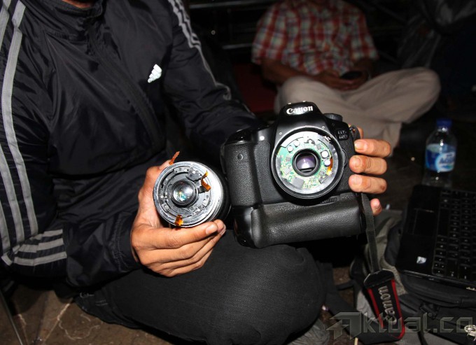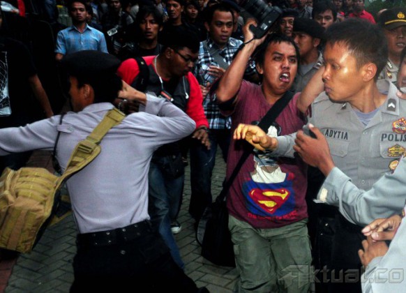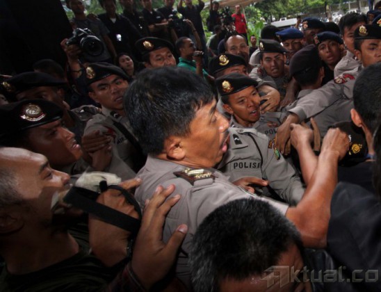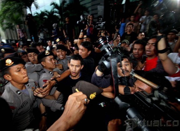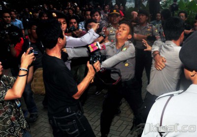 Para Jurnalis yang meliput Gubernur Banten Ratu “Koruptor” Atut Chosiyah yang akan masuk ke mobil Tahanan terlibat keributan dengan polisi di halaman gedung Komisi Pemberantasan Korupsi (KPK), Jumat (20/12/2013). Akibat dari tindakan brutal anggota polisi yang memukul para jurnalis, lensa kamera milik pewarta foto Rakyat Merdeka rusak karena patah dan flash pewarta foto sayangi.com hilang. Aktual/dok Pewarta Foto Indonesia