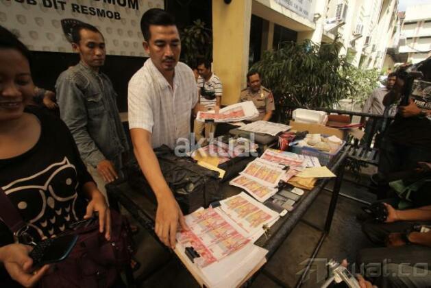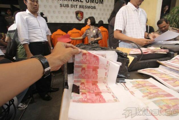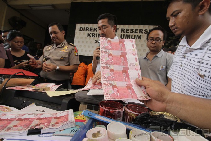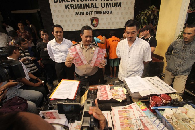 Kabid Humas Polda Metro Jaya Kombes Rikwanto dan Kasubdit Resmob Polda Metro Jaya, AKBP Adex Yudiswan dengan empat tersangka sindikat pencetak dan pengedar uang palsu saat dihadirkan di Mapolda Metro Jaya, Senin (28/4/2014). Uang palsu yang diedarkan oleh sindikan pencetak uang yang baru ditangkap oleh Polda Metro Jaya berkualitas sangat baik. Mereka mengaku sudah 6 bulan mengedarkan uang palsu senilai sekitar Rp 500 Juta. Para tersangka kata Adex akan dijerat Pasal 244 KUHP dan Pasal 245 KUHP tentang mencetak serta menyimpan dan mengedarjan mata uang palsu dengan ancaman hukuman diatas 5 tahun penjara. Aktual/Tino Oktaviano