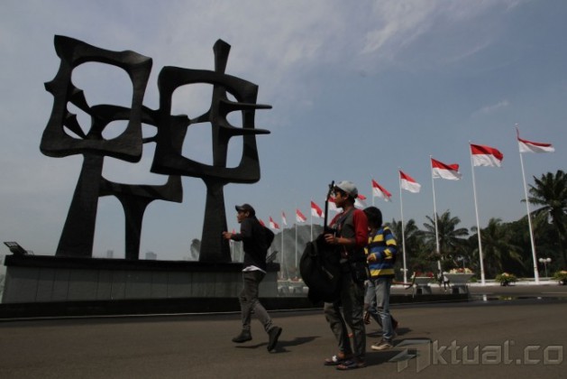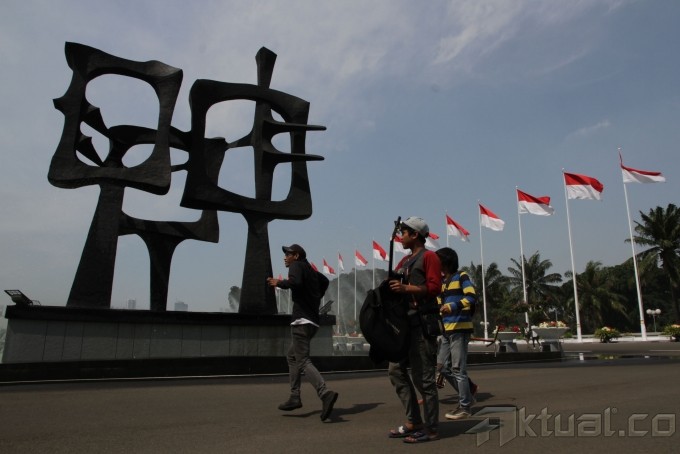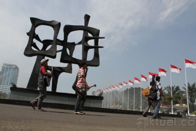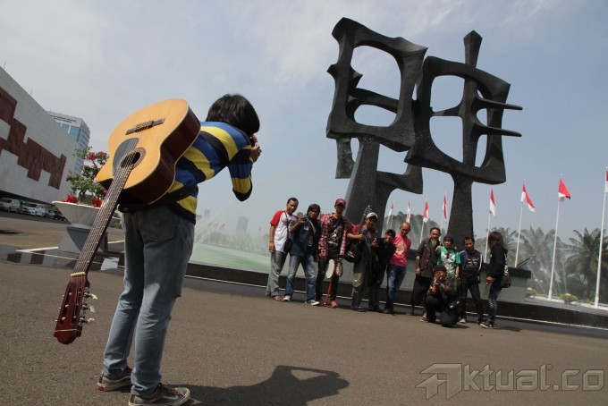 Beberapa pemusik jalanan berfoto depan gedung DPR, Senayan Jakarta, Kamis (22/8), saat mendaftar lomba cipta lagu Empat Pilar Kehidupan Berbangsa dan Bernegara MPR RI 2013. Dalam rangka meningkatkan pengetahuan, pemahaman, dan penghayatan tentang Empat Pilar Kehidupan Berbangsa dan Bernegara Pancasila, Majelis Permusyawaratan Rakyat Republik Indonesia akan melaksanakan ”FESTIVAL DAN LOMBA CIPTA LAGU” Empat Pilar Kehidupan Berbangsa dan Bernegara. Aktual/Tino Oktaviano