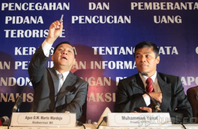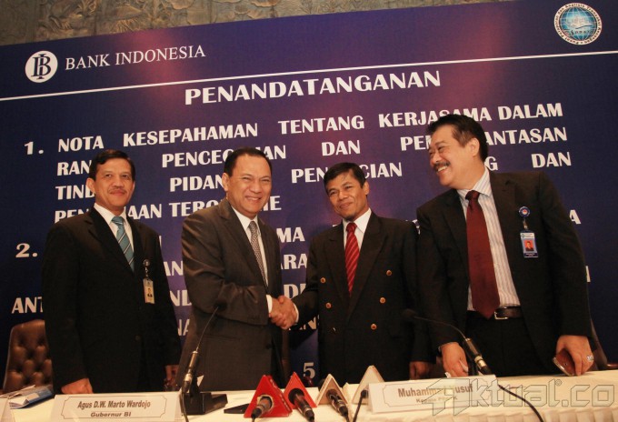Gubernur Bank Indonesia Agus Marto Wardojo (kiri), bersama Ketua Pusat Pelaporan dan Analisis Transaksi Keuangan (PPATK) Muhammad Yusuf (kanan) memberikan keterangan usai penandatanganan nota kesepahaman di Jakarta, Kamis (5/3). BI bekerja sama dengan PPATK dalam rangka pencegahan dan pemberantasan tindak pidana pencucian uang dan terorisme serta membuat perjanjian mengenai tata cara pelaksanaan pertukaran informasi. ANTARA FOTO/Akbar Nugroho Gumay