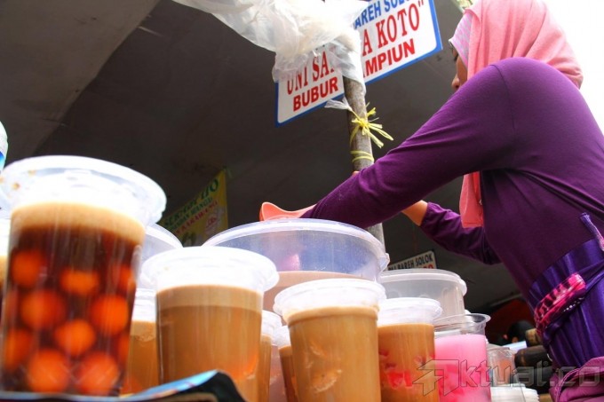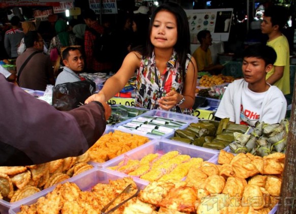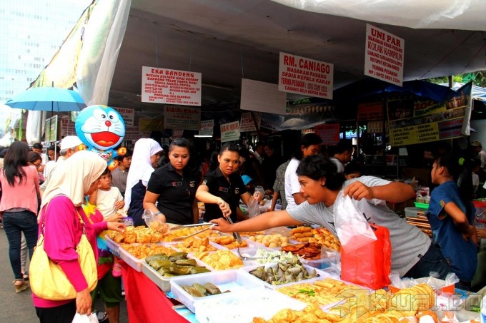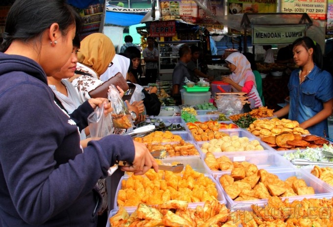 Seorang pembeli memilih makanan takjil di Pasar Benhil, Jakarta, Jumat(19/7). Banyak orang yang mencari jajanan pasar untuk dinikmati saat berbuka puasa. Makanan manis, camilan, serta makanan khas buka puasa seperti kolak, gorengan, es buah, ayam goreng, macaroni panggang. Aktual/Oke Dwi Atmaja