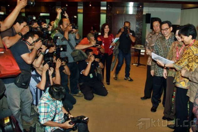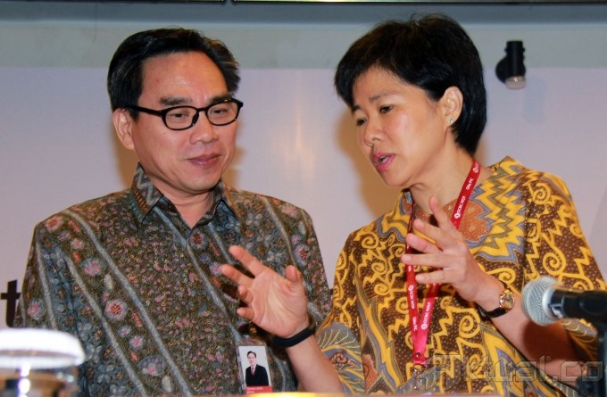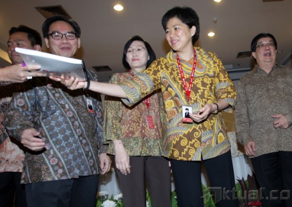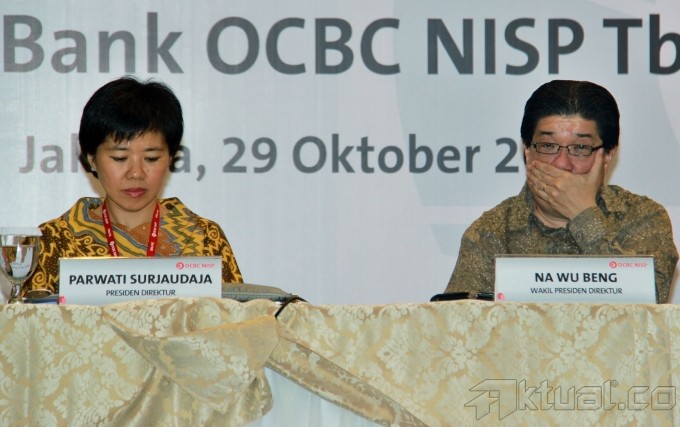 Dirut PT Bank OCBC NISP Tbk (NISP) Parwati Surjaudaja (kedua kanan), didampingi Wadirut NISP Na Wu Beng (kanan), Direktur NISP Hartati (tengah) dan Direktur NISP Thomas Arifin (kedua kiri), disela paparan kinerja perusahaan di Jakarta, Selasa (29/10/2013). berbincang usai rapat umum pemegang saham luar biasa, di Jakarta, Selasa (29/10). Bank OCBC NISP melakukan penawaran umum terbatas ke-7 dengan memesan efek terlebih dahulu sebesar Rp 3,5 trliun, untuk memperkuat struktur permodalan, pengembangan bisnis dan memperluas pertumbuhan usaha dalam bentuk pemberian kredit. Aktual/Tino Oktaviano