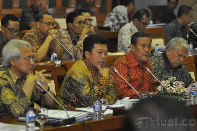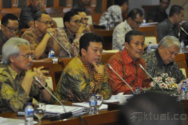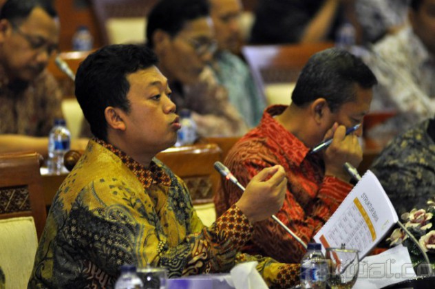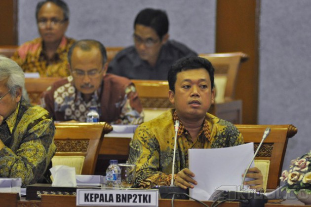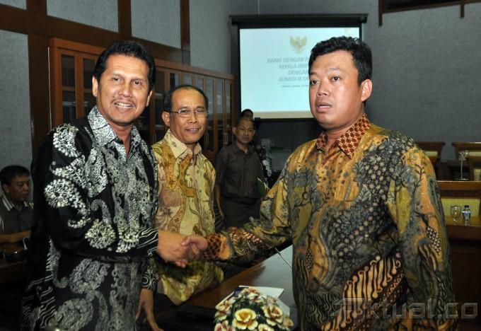 Kepala Badan Nasional Penempatan dan Perlindungan Tenaga Kerja Indonesia (BNP2TKI), Nusron Wahid berjabat tangan dengan Wakil Komisi IX DPR RI, Asman Afnur di Ruang Rapat Komisi IX DPR, Senayan, Jakarta, Selasa (14/4/2015). Rapat dengar pendapat tersebut membahas progres review biaya penempatan TKI yang saat ini masih mahal, layanan terpadu satu pintu serta membahas masalah mafia dan calo dalam penyaluran TKI. AKTUAL/JUNAIDI MAHBUB