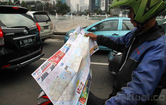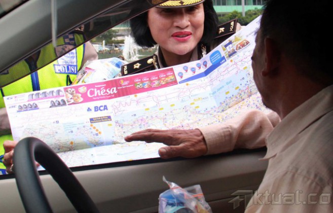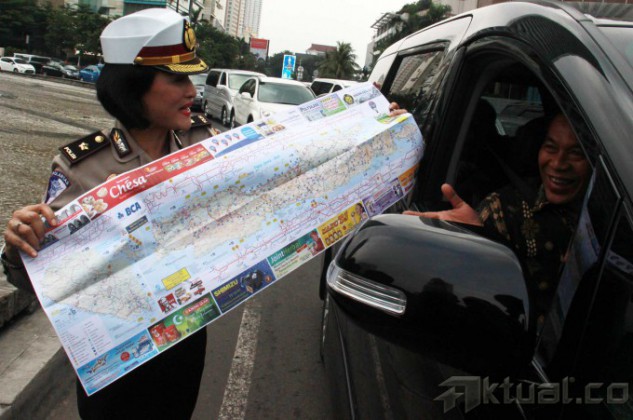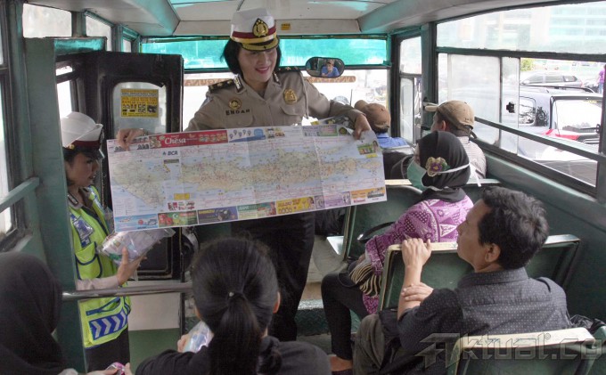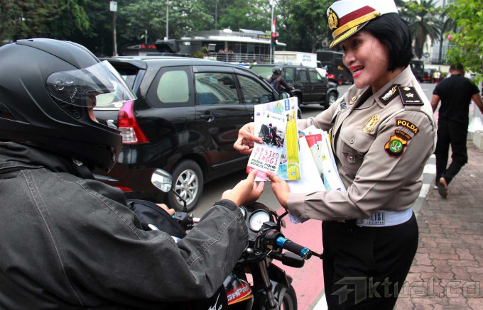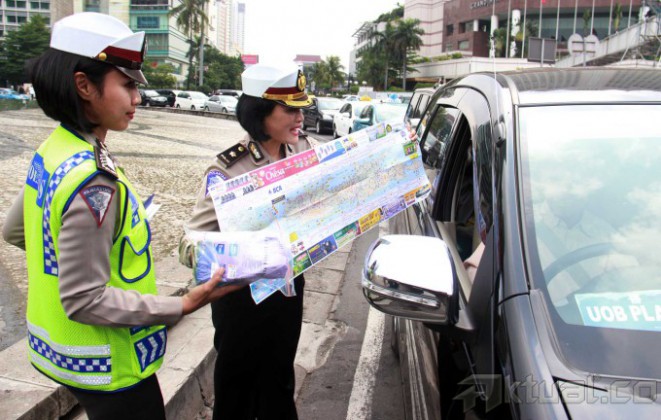 Sejumlah Anggota Polantas Polda Metro Jaya memberikan info mudik 2014 serta memberikan himbauan keselamatan berkendara saat mudik di kawasan Bundaran Hotel Indonesia, Jumat (18/7/2014). Hal tersebut dilakukan jajaran Polri untuk menekan angka kecelakaan saat mudik lebaran. Aktual/Tino Oktaviano