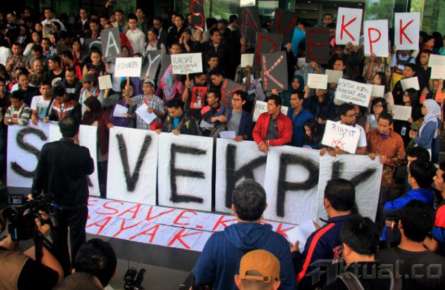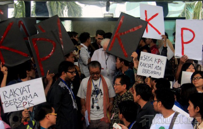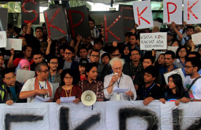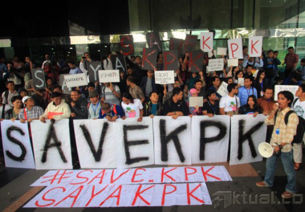 Ratusan Massa penggiat anti korupsi melakukan aksi Save Komisi Pembrantasan Korupsi (KPK), di gedung KPK, jalan Rasuna Said, Jakarta Selatan, Jumat (23/1/2015). Aksi yang di hadiri para tokoh-tokoh agama dan para penggiat anti korupsi ini untuk menghimbau semua kalangan untuk menghentikan pertikaian antara KPK dan Polri. AKTUAL/MUNZIR