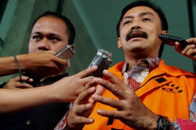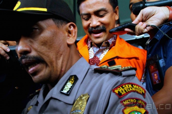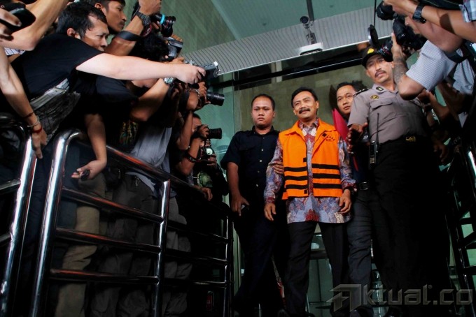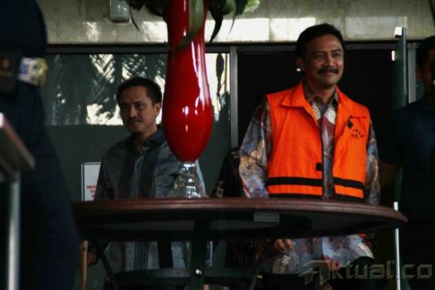 Mantan Menteri Pemuda dan Olahraga (Menpora) Andi Mallarangeng mengenakan baju tahanan Komisi Pemberantasan Korupsi (KPK) warna oranye ketika usai menjalani pemeriksaan terkait kasus suap proyek Hambalang di KPK Jakarta, Kamis (17/10/2013). Andi di tahan KPK terkait korupsi pengadaan sarana dan prasarana dalam proyek pembangunan Hambalang senilai Rp 2,5 triliun. Aktual/Oke Dwi Atmaja