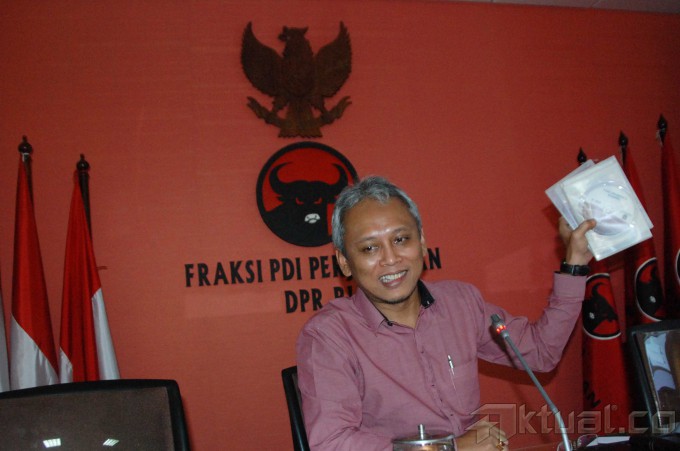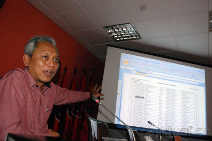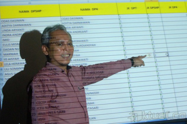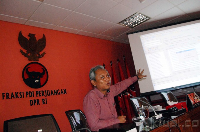 Wakil Ketua Komisi II Arief Wibowo menunjukan data melalui layar saat konferensi pers mengenai kisruh Daftar Pemilih Tetap (DPT), di ruang Fraksi PDIP, Gedung Parlemen, Jakarta, Selasa (12/11/2013). Beberapa waktu lalu, KPU telah menetapkan 186 juta pemilih masuk daftar pemilih tetap (DPT), namun 10,4 juta ternyata tanpa NIK. Setelah disisir, KPU berhasil melengkapi 3,2 juta NIK pemilih sehingga hanya tersisa 7,2 juta pemilih tanpa NIK. Aktual/Tino Oktaviano