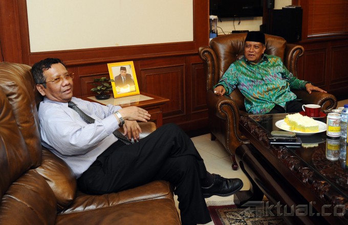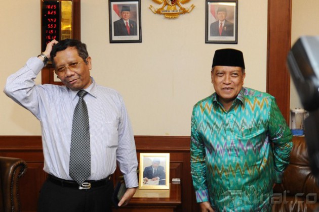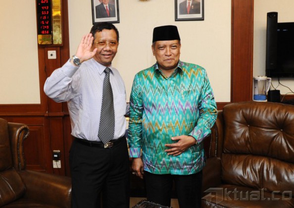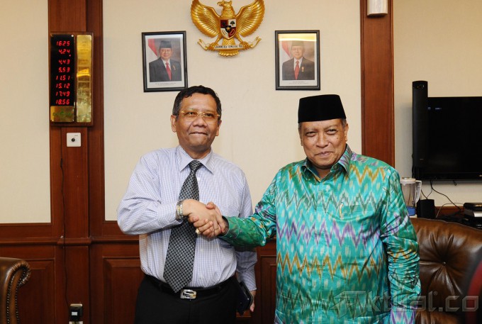 Ketua Umum Pengurus Besar Nahdlatul Ulama (PBNU) KH Said Aqil Siroj menerima kedatangan mantan Ketua Mahkamah Konstitusi Mahfud MD di Gedung PBNU, Jakarta, Kamis (24/4/2014). Mahfud yang digadang-gadangkan sebagai Calon Presiden (Capres) dari Partai Kebangkitan Bangsa (PKB) ini, melakukan pertemuan tertutup dengan PBNU. Seperti diketahui kandidat Capres dari PKB ini lebih memilih merapat ke Capres PDI Perjuangan Joko Widodo (Jokowi) dibandingkan Capres lain. Aktual/Tino Oktaviano