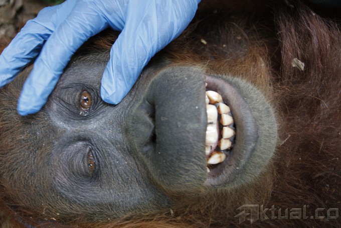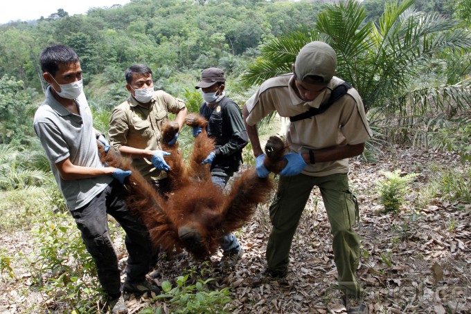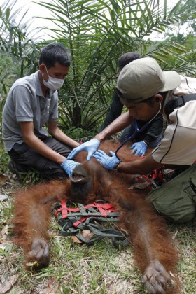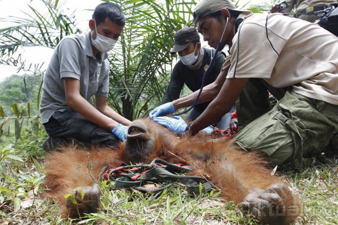 Petugas Yayasan Orangutan Sumatera Lestari – Orangutan Information Centre (YOSL-OIC) dan BBKSDA Sumut mengevakuasi orangutan sumatra (Pongo abelii) di Desa Kuala Musam, Langkat, Sumatera Utara, Senin (30/3). Orangutan betina berumur 20 tahun tersebut, dievakuasi setelah terisolir di perkebunan sawit. ANTARA FOTO/Irsan Mulyadi