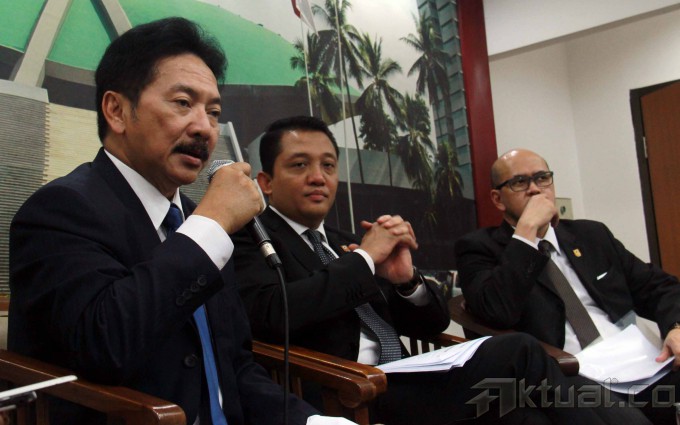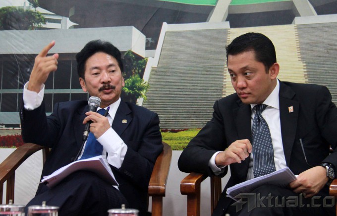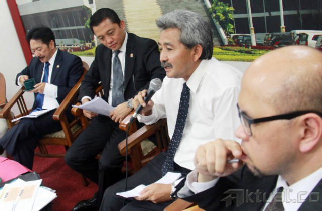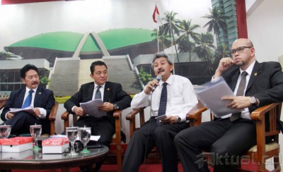 Dari kiri ke kanan, Ketua Panitia Khusus (Pansus) RUU Keinsinyuran Rully Chairul Azwar, Ketua Umum Persatuan Insinyur Indonesia (PII) Bobby Gafur Umar, Wakil Menteri Pekerjaan Umum Ahmad Hermanto Dardak dan Sekjen PII Danang Parikesit, saat berdiskusi di press room DPR, Jakarta, Selasa (25/2/2014). Rancangan Undang-Undang (RUU) tentang Keinsinyuran disahkan menjadi undang-undang (UU) dalam rapat paripurna DPR, UU tersebut dinilai sangat penting dan mendesak untuk menunjang dan mendorong master plan MP3EI. RUU Keinsinyuran merupakan perhatian DPR terhadap profesi insinyur. Tantangan ke depan semakin nyata karena Indonesia akan menghadapi Asean Economic Community (AEC). Aktual/Tino Oktaviano