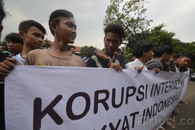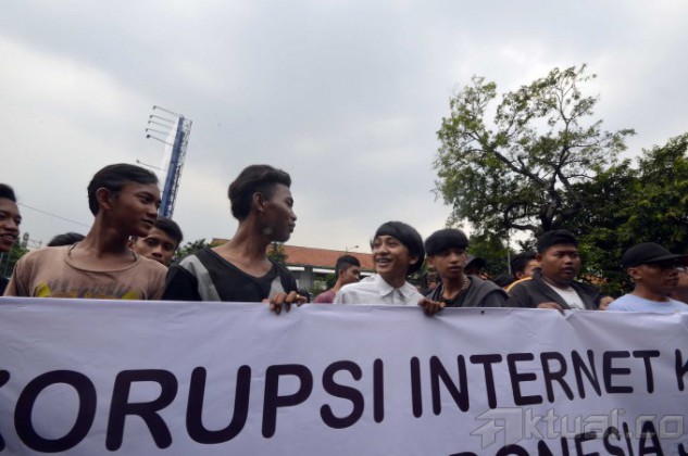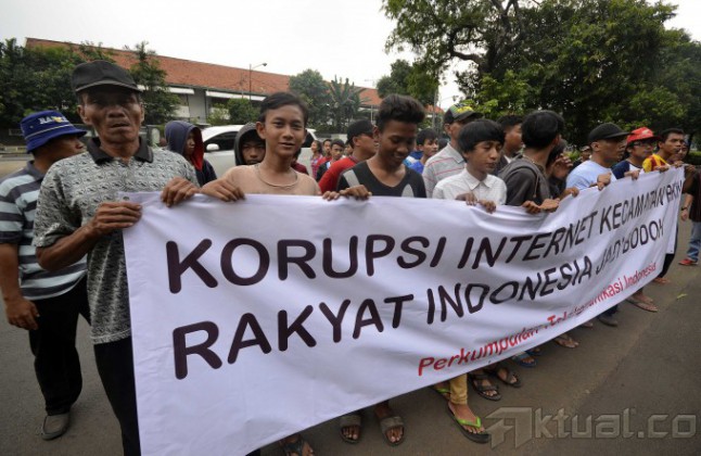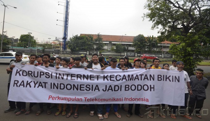 Sejumlah massa yang tergabung dalam Perkumpulaan Telekomunikasi Indonesia menggeruduk gedung Kejaksaan Agung Republik Indonesia, Rabu (2/7/2014). Mereka melakukan unjukrasa, agar Kejagung segera mengusut dugaan keterlibatan Menteri Komunikasi dan Informatika (Kominfo) Tifatul Sembiring atas kasus korupsi pengadaan Mobil Pusat Layanan Internet Kecamatan (MPLIK) tahun 2010-2012. Aktual/Tino Oktaviano