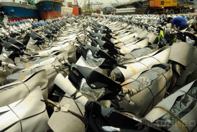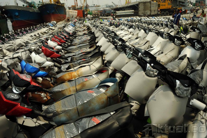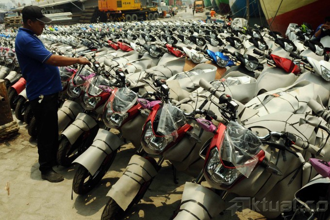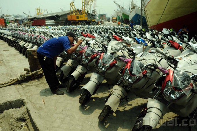 Pekerja memeriksa sepeda motor yang akan dimasukan kapal antar pulau di Pelabuhan Sunda Kelapa, Jakarta Utara, Selasa (5/11/2013). Penjualan sepeda motor pada September 2013 mencapai 678.139 unit, naik 38,1 persen dibandingkan sebulan sebelumnya yang mencapai 490.824 unit. Berdasarkan data Asosiasi Industri Sepeda Motor Indonesia (AISI) menyebutkan, bulan lalu, motor Honda terserap pasar sebanyak 417.760 unit, kemudian Yamaha 216.919 unit, Kawasaki 10.791 unit dan TVS 1.797 unit. Aktual/Tino Oktaviano