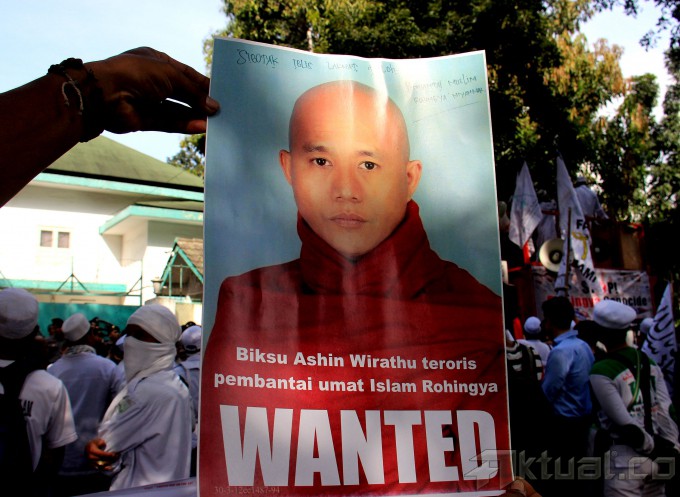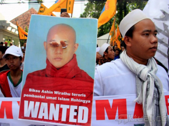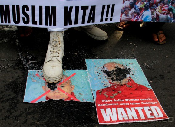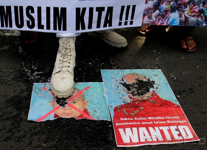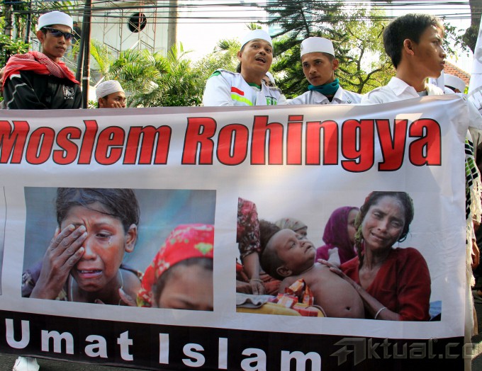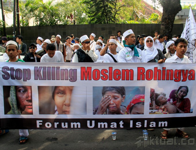 Ratusan massa yang tergabung dalam Forum Umat Islam (FUI) melakukan aksi di depan Kedutaan Besar Myanmar, Jakarta Pusat, Rabu (27/5/2015). Aksi ini mengutuk keras pemerintah Myanmar atas pembantaian umat Islam etnis Rohingya. AKTUAL/MUNZIR
