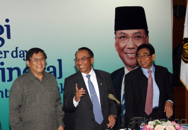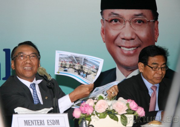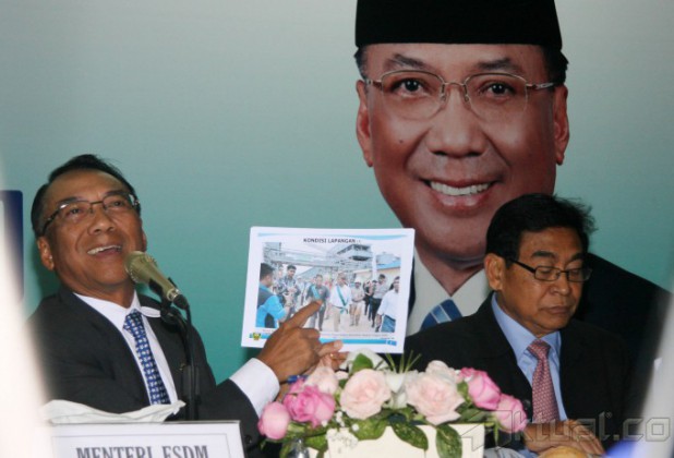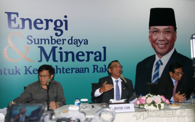 Menteri Energi dan Sumber Daya Mineral (ESDM) Jero Wacik (kiri) didampingi Wamen ESDM Susilo Siswoutomo (kanan), menyampaikan mulai diberlakukannya Undang-Undang Mineral dan Batubara (Minerba) no 4 tahun 2009 di kantor Kementerian ESDM, Jakarta, Senin (13/1/2014). Pemerintah telah menyelesaikan peraturan larangan ekspor bahan tambang mineral mentah tersebut telah efektif diimplementasikan. UU Minerba tersebut, dampaknya akan sangat baik bagi Indonesia. Aktual/Tino Oktaviano