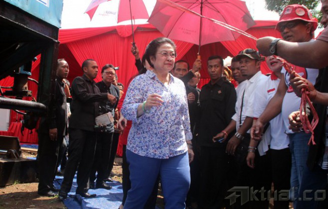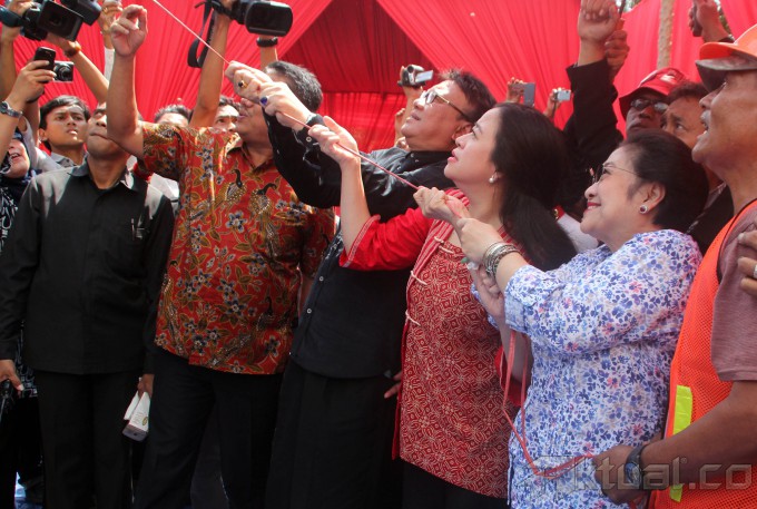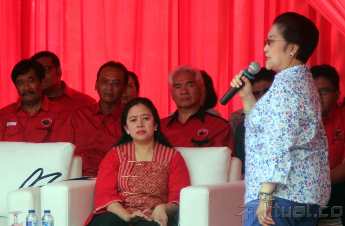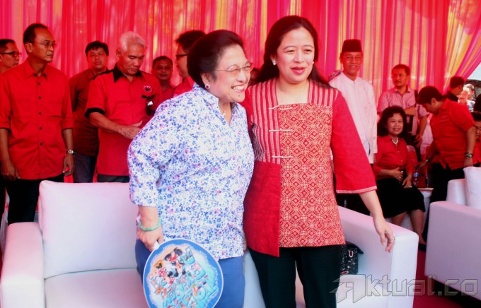 Ketua Umum PDIP Megawati Soekarnoputri, didampingai Ketua DPP PDIP Puan Maharani, saat acara peletakan batu pertama pembangunan kantor DPP PDIP di Jalan Diponegoro No 58, Menteng, Jakarta, Jumat (16/5/2014). Nantinya kantor tersebut akan digunakan untuk pusat pelatihan kader PDIP. Aktual/Tino Oktaviano