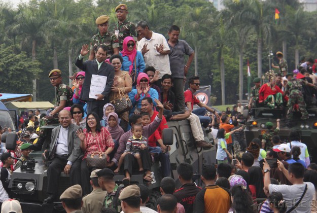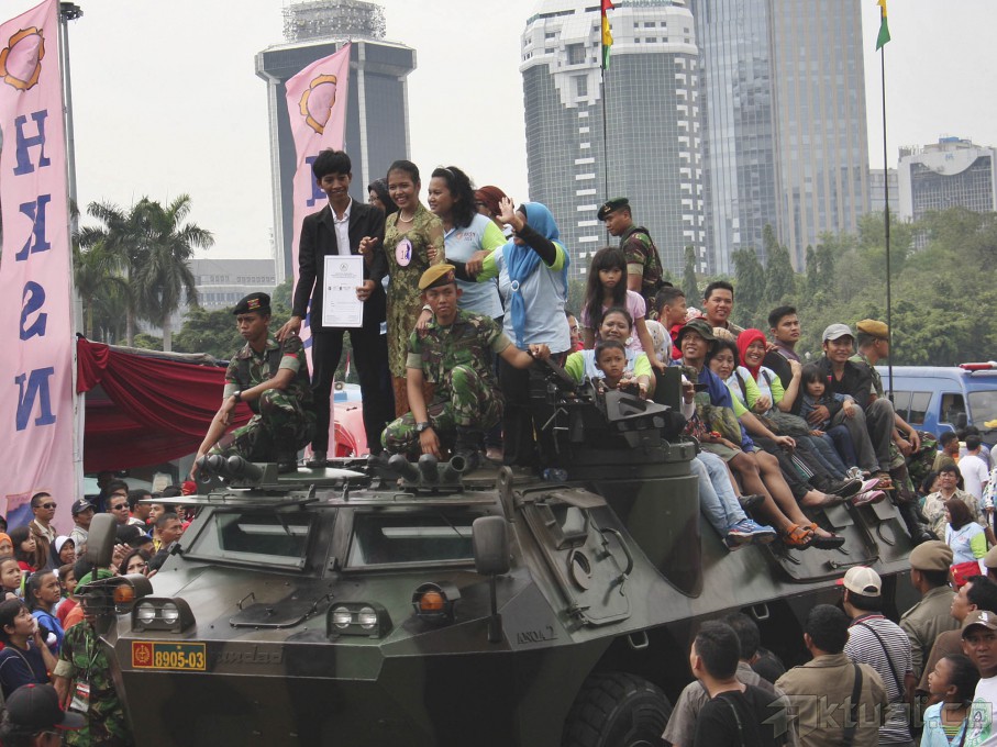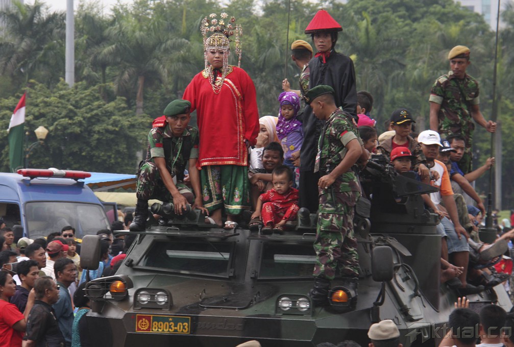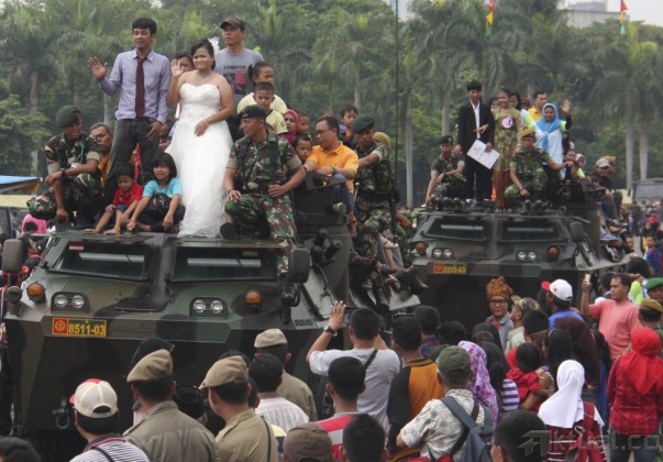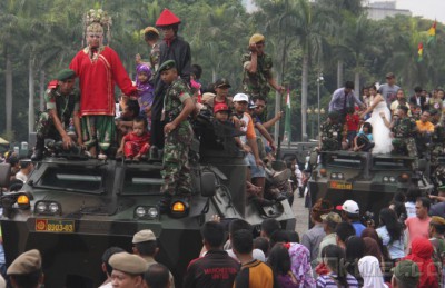 Pasangan nikah massal mengenakan pakaian tradisional diarak dengan menggunakan Panse Anoa TNI AD saat peringatan Hari Kesetiakawanan Sosial Nasional 2014 di Lapangan Monas, Jakarta, Sabtu (13/12/2014). Puluhan pasangan nikah massal ini diarak berkeliling lapangan Monas. AKTUAL/TINO OKTAVIANO