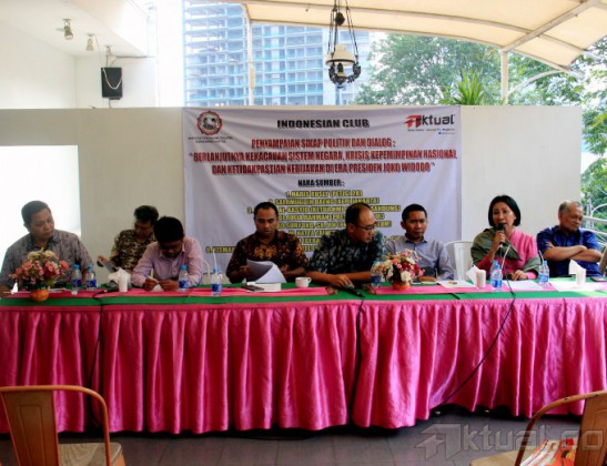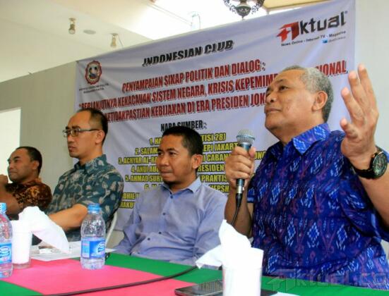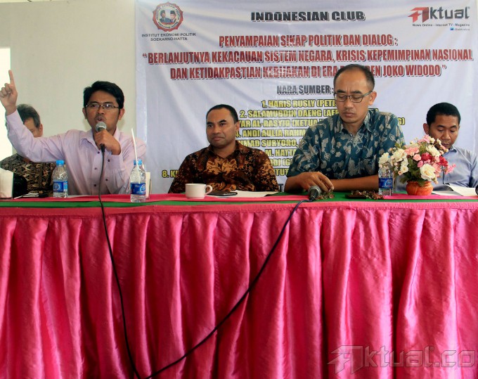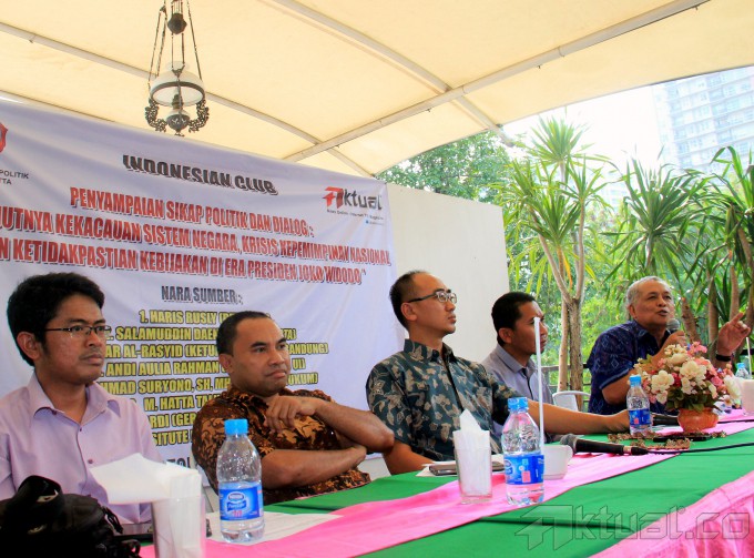 Dari kiri ke kanan, Ketua Gerakan Indonesia Bersih (GIB) Adhi Massardi, Pratiksi Hukum Ahmad Suryono, Petisi28 Haris Motti, Moderator Gigih Guntoro, Direktur AEPI Jakarta Salamudin Daeng, Seniman Ratna Sarumpaet, Direktur Indonesia Club Insitute Ekonomi Politik Soekarno- Hatta (IEPSH) M. Hatta Taliwang dalam diskusi ” Berlanjutnya Kekacauan Sistem Negara, Krisis Kepimpinan Nasional Dan Kepastian Kebijakan Di Era Presiden Joko Widodo” di warung Ekomando, Jakarta Selatan, Selasa (19/5/2015).Haris Rusly, mengatakan bahwa selama ini Presiden Jokowi hanya menempatkan dirinya sebagai kepala pemerintah, yang sifatnya melakukan teknis pembangunan infrastruktur dan pelayanan publik saja. Bahkan, meski menjabat sebagai presiden Jokowi menujukan dirinya masih bekerja seperti Wali Kota maupun Gubernur, setingkat nasional saja. AKTUAL/MUNZIR
