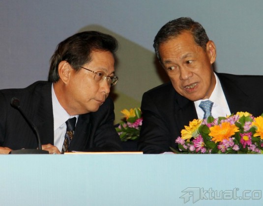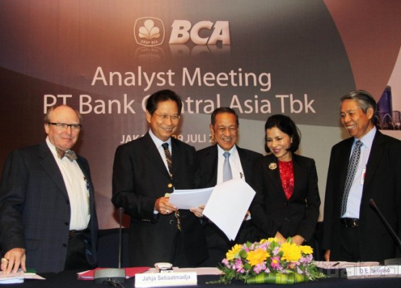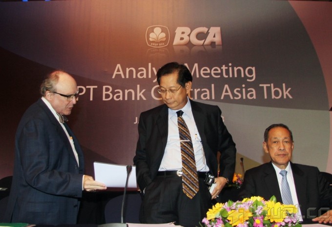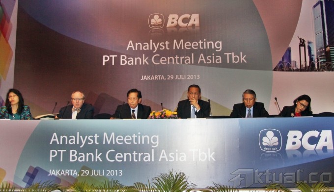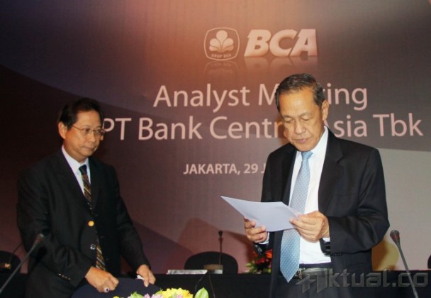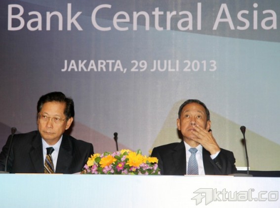 Preskom PT Bank Central Asia TBK (BBCA) D E Setijoso (kanan), bersama Presdir BBCA Jahja Setiaatmadja (kiri), sebelum menyampaikan hasil kinerja periode Januari – Juni 2013 di Jakarta, Senin (29/7). BBCA melaporkan pencapaian laba bersih semester I 2013 Rp 6,3 triliun, meningkat 19,3% dari Rp 5,3 triliun pada periode yang sama tahun 2012. Aktual/Tino Oktaviano