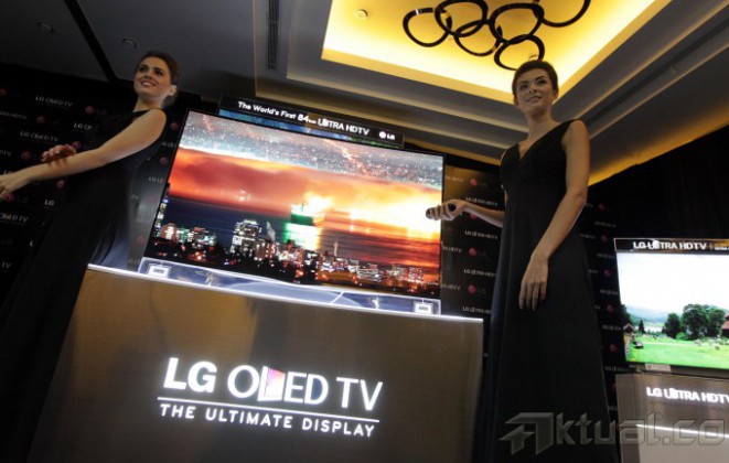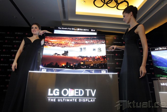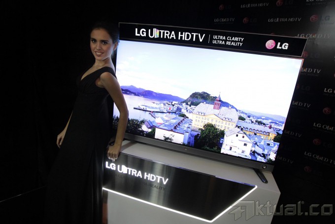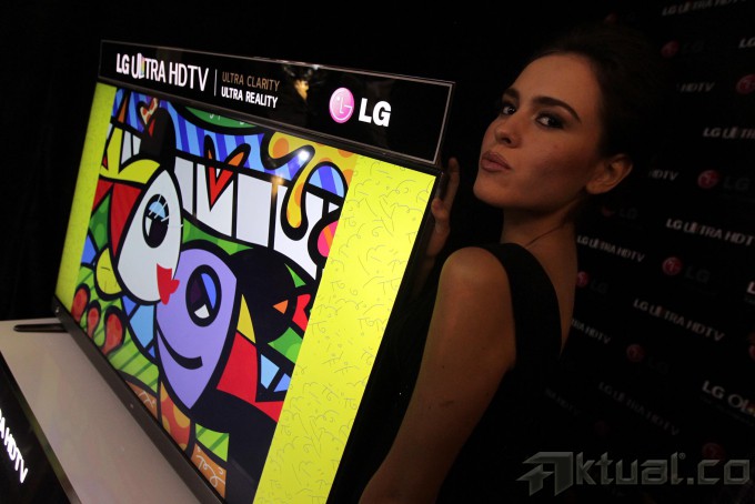 Seorang model berpose saat peluncuran Ultra High Definition Tv (ultra HD Tv) di Jakarta, Kamis (14/11/2013). LG Electronics Indonesia kembali membuat gebrakan baru dipasar elektronik dalam negeri dengan meluncurkan Ultra High Definition Tv (ultra HD Tv) dengan dimensi layar 65 inch dan 55 inch. Aktual/Tino Oktaviano