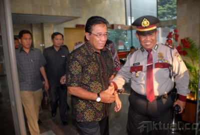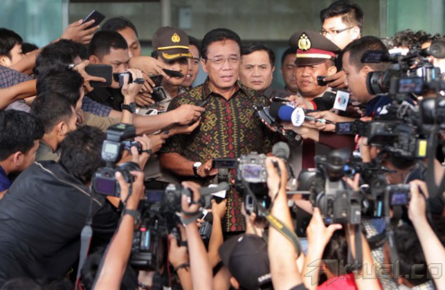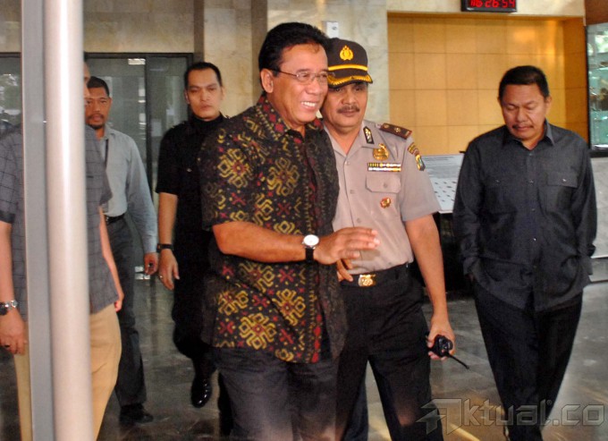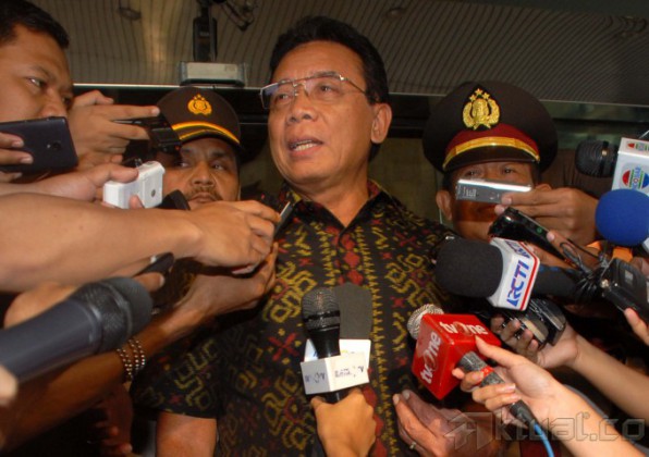 Menteri Koordinator Politik Hukum dan Keamanan, Djoko Suyanto, diserbu wartawan usai diperiksa di gedung Komisi Pemberantasan Korupsi (KPK), Jakarta, Selasa (16/9/2014). Djoko diperiksa sebagai saksi dalam kasus yang menjerat mantan Menteri Energi dan Sumber Daya Mineral, Jero Wacik. Jero ditetapkan sebagai tersangka atas dugaan pemerasan di Kementerian ESDM. AKTUAL/JUNAIDI MAHBUB