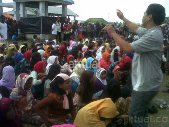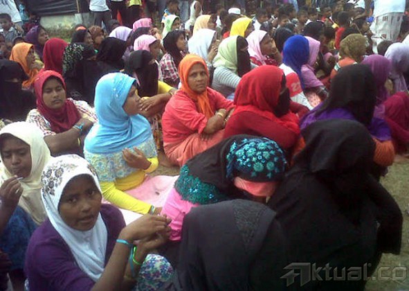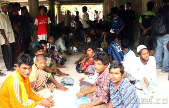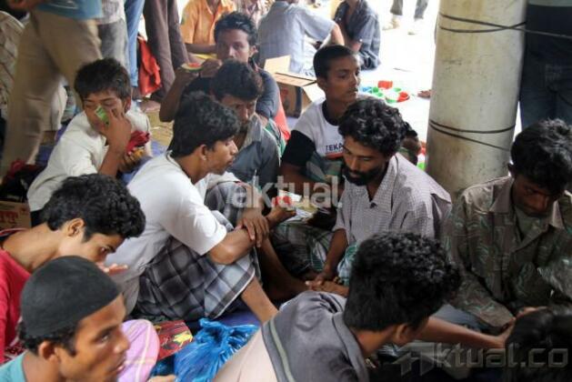 Imigran Rohingya asal Banglades dan Myammar berkumpul di tempat penampungan sementara, Kota Langsa, Aceh, Jumat (15/5/2015). Pihak Imigrasi menyebutkan sebanyak 648 imigran suku Rohingya yang terdiri dari 418 jiwa asal Banglades dan 230 imigran Myammar terdampar di perairan Kuala Langsa, Aceh dan ditolong oleh nelayan. AKTUAL/MASRIADI SAMBO