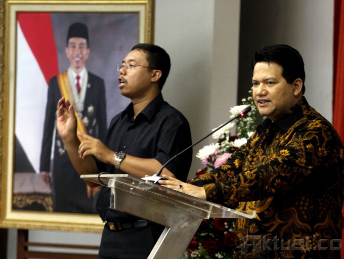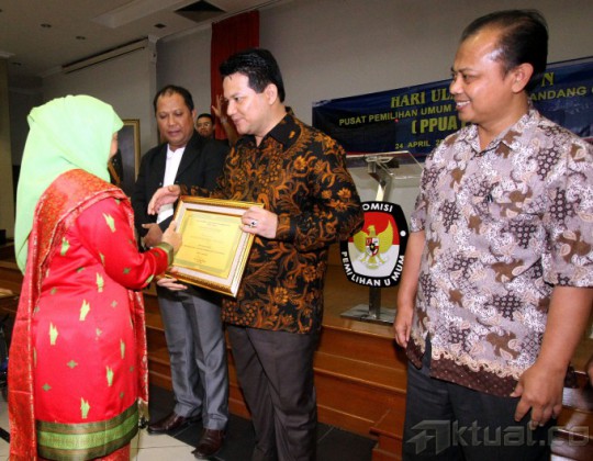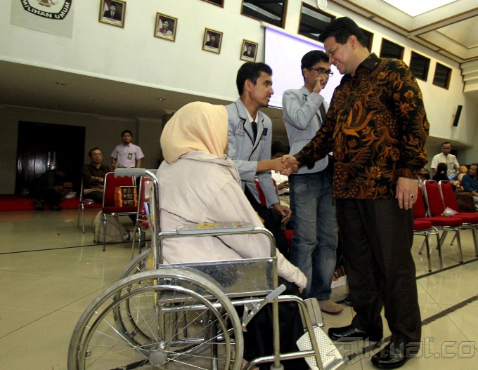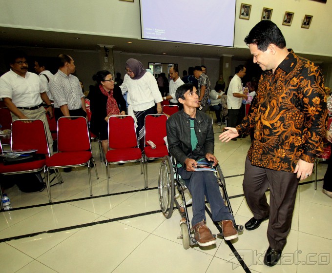 Ketua Komisi Pemilihan Umum (KPU) Husni Malik Kamil berbincang dengan penyandang disabilitas di gedung KPU dalam acara Refleksi 13 tahun PPUA Penca, di kantor KPU Pusat, Jakarta, Selasa (5/5/2015). PPUA Penca fokus terhadap advokasi pemajuan hak-hak politik para penyandang disabilitas dan meningkatkan perannya dalam mewujudkan pemilu yang aksesibel dan ramah bagi semua orang. AKTUAL/MUNZIR
