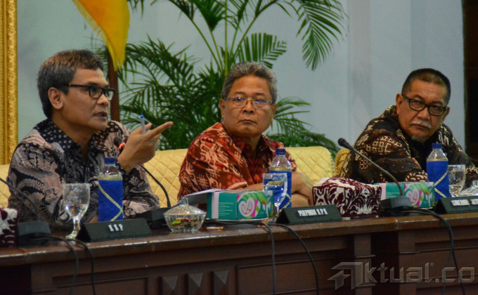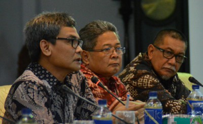 Pelaksana Tugas Wakil Ketua KPK Johan Budi (kiri) bersama Wagub Jateng Heru Sudjatmoko (tengah) dan Wagub Jabar Deddy Mizwar (kanan), saat berbicara pada rapat monitoring dan evaluasi Gerakan Nasional Penyelamatan Sumber Daya Alam Sektor Kelautan, di gedung Gradhika Bhakti Praja Semarang, Jateng, Selasa (19/5). Pertemuan ini merupakan upaya KPK dalam menjalankan fungsi untuk mengatasi sejumlah persoalan pada pengelolaan Sumber Daya Alam di sektor kelautan. ANTARA FOTO/R. Rekotomo