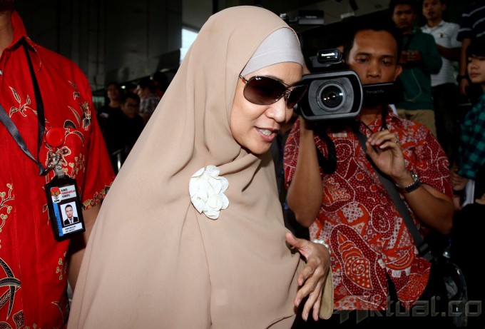 Artis Mediana Hutomo saat keluar usai manjalani pemeriksaan di gedung Komisi Pemberantasan Korupsi (KPK), Jakarta, Jumat (29/5/2015). Mediana menjadi saksi dalam kasus dugaan korupsi alat kesehatan dengan tersangka mantan Menteri Kesehatan Siti Fadilah Supari. AKTUAL/MUNZIR