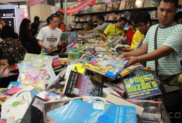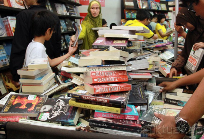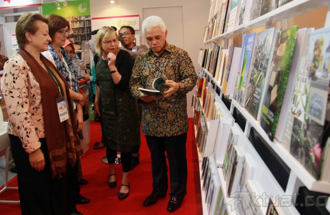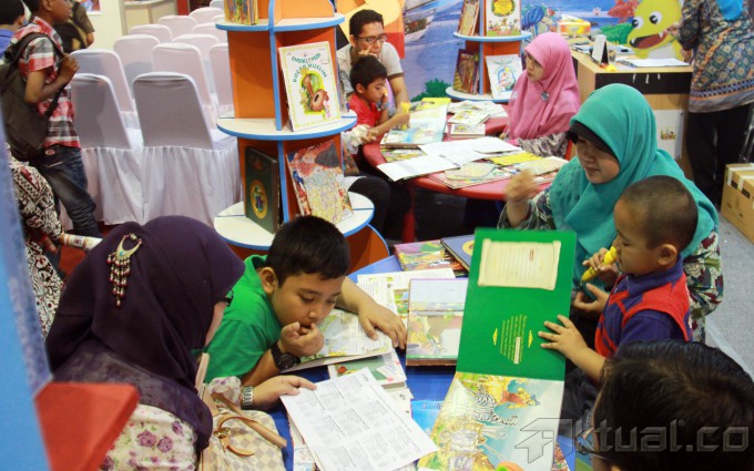 Menko Perekonomian Hatta Rajasa (tengah) foto bersama usai mendongeng cerita rakyat dihadapan anak-anak saat membuka Indonesia Book Fair ke-33 di Istora Senayan, Jakarta, Sabtu (2/11/2013). Pameran tersebut diikuti sejumlah penerbit buku dalam dan luar negeri yang belangsung hingga 10 November 2013.Aktual/Tino Oktaviano
