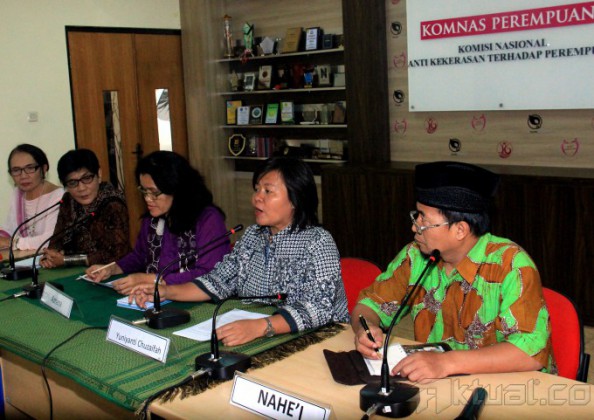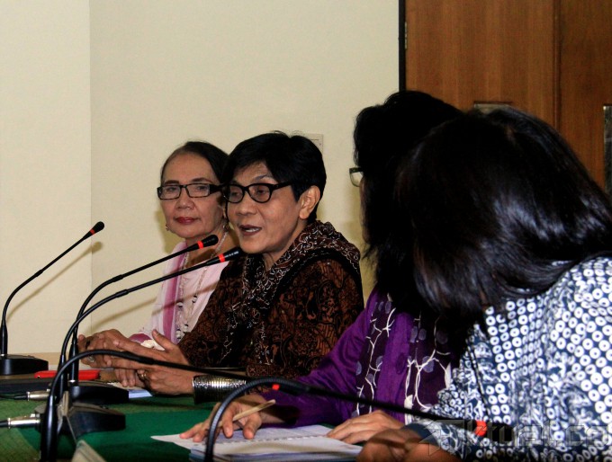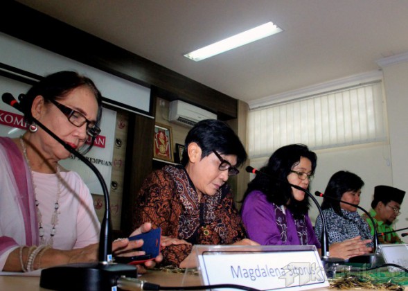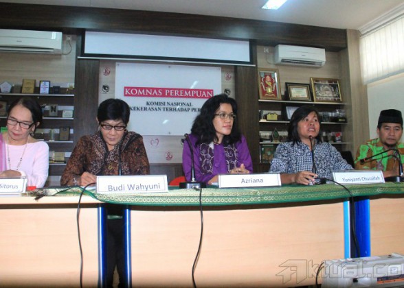 Dari kiri ke kanan, Komisioner Komnas Perempuan( KP) Magdalena Sitorus, Wakil Ketua KP Budi Wahyuni, Ketua Komnas Perempuan Azriana, Wakil Ketua Komnas Perempuan Yuni Yanti Chuzaifah, Komisioner Komnas Perempuan Iman Nahe dalam menggelar jumpa persnya di Komnas Perempuan, Jalan Latuharhary, Jakarta Pusat, Rabu (29/4/2015). Komnas Perempuan yakin Mary Jane bukan bagian dari sindikat narkoba, Mary Jane adalah korban perdangangan orang. AKTUAL/MUNZIR