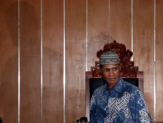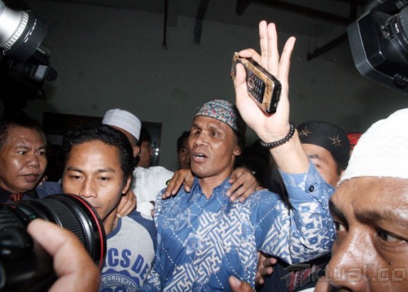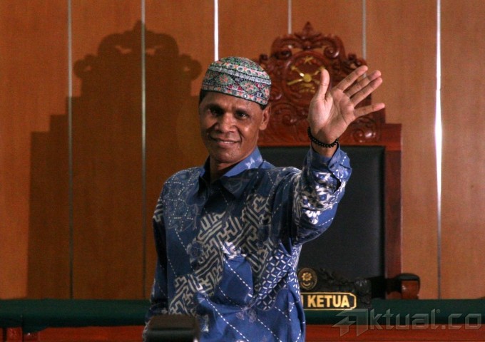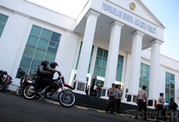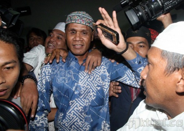Hercules Rozario Marshall (batik biru) dikawal sejumlah pendukungnya saat akan menjalani sidang perdana di Pengadilan Negeri Jakarta Barat, Kamis (30/5). Hercules dijerat polisi dengan tuduhan melakukan tindak premanisme dan pemerasan. Selain itu, dia juga dinilai melawan hukum karena melawan saat hendak ditangkap oleh polisi. Aktual/Tino Oktaviano