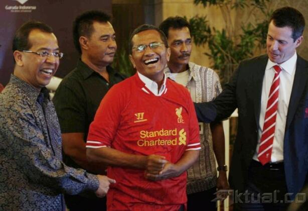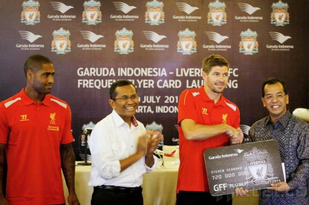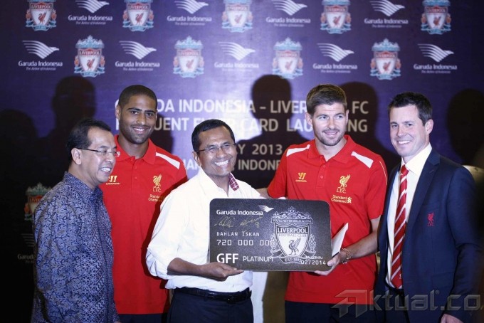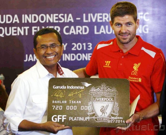 Menneg BUMN Dahlan Iskan (kiri), menyerahkan replikan kartu kepada Pemain Liverpool FC Steven Gerrard, saat peluncuran ‘Garuda Frequent Flyer-Liverpool Football Club Edition Card’ di Jakarta, Jumat (19/7). Menteri BUMN, Dahlan Iskan, mendapat kesempatan langka berjumpa dengan skipper Liverpool, Steven Gerrard. Sebagai penggemar the Reds, ia mengaku sangat ‘happy’ dapat berjumpa langsung dengan pemain Liverpool FC Steven Gerrard, Glen Johnson. Aktual/Tino Oktaviano