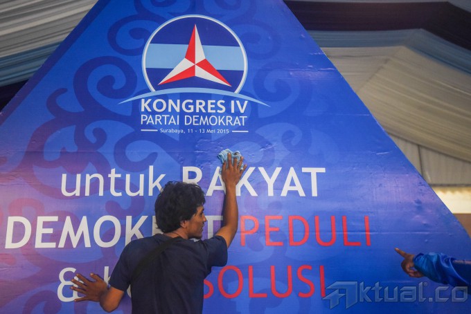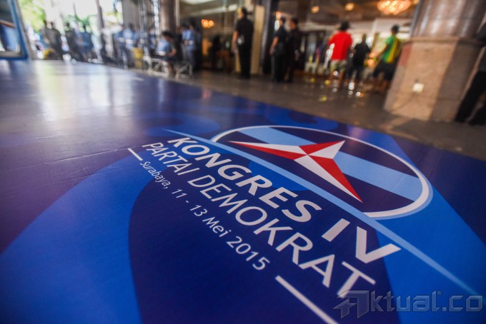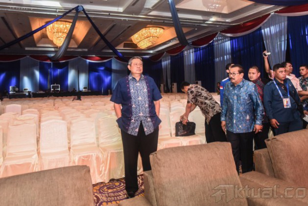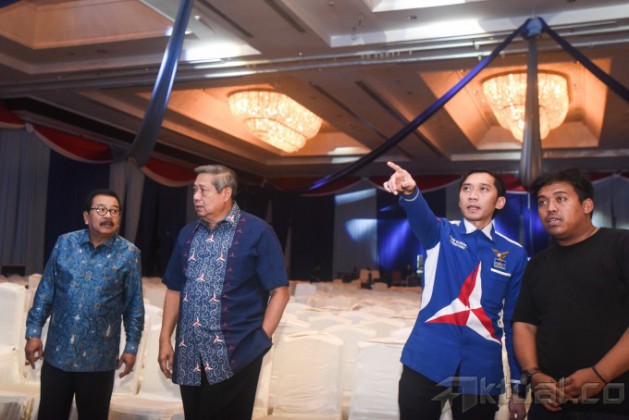 Ketua Umum Partai Demokrat Susilo Bambang Yudhoyono (kedua kiri) didampingi Sekretaris Jenderal Partai Demokrat Edhie Baskoro Yudhoyono (kedua kanan) dan Gubernur Jawa Timur Soekarwo (kiri) memantau persiapan pembukaan kongres Partai Demokrat ke-IV di Hotel Shangrila, Surabaya, Jawa Timur, Senin (11/5). Pembukaan kongres yang menghabiskan anggaran sekitar Rp9 miliar tersebut akan dihadiri sedikitnya 1.200 kader yang berasal dari seluruh wilayah Indonesia. ANTARA FOTO/Zabur Karuru