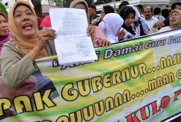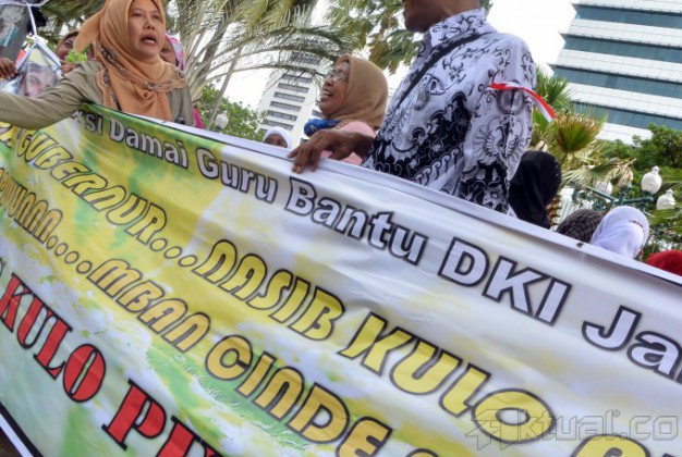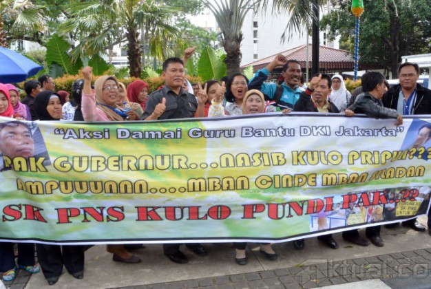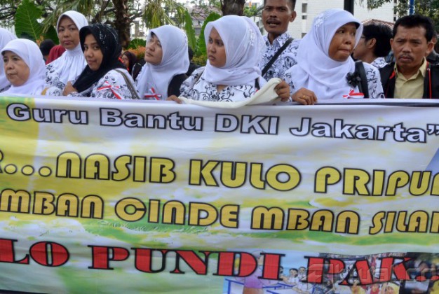 Puluhan guru bantu se-DKI Jakarta menggelar aksi damai di depan Balai Kota, Jakarta, Senin (25/11/2013). Mereka meminta Gubernur DKI Jakarta, Joko Widodo untuk menyelesaikan permasalahan guru bantu SD, SMP, dan SMA, yang dijanjikan mendapatkan SK Pegawai Negeri Sipil (PNS). Aktual/Tino Oktaviano
