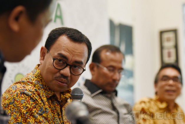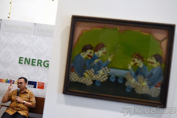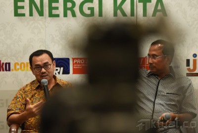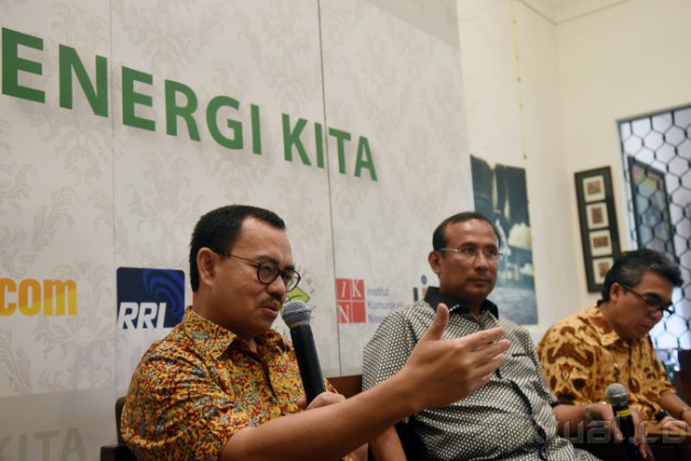 Menteri Energi dan Sumber Daya Mineral (ESDM) Sudirman Said (kiri) didampingi Wakil Ketua Komisi VII DPR Sayta Widya Yudha (kanan) menjadi pembicara pada diskusi Daerah Darurat Listrik, Bagaimana Mencapai 35 ribu MW di Jakarta, Minggu (1/3). Menurut Sudirman Said saat ini negara masih membutuhkan listrik sebanyak 42 ribu megawatt dan pemerintah akan membangun proyek 35 ribu megawatt ditambah utang listrik yang belum dikerjakan 7.900 megawatt. ANTARA FOTO/M Agung Rajasa