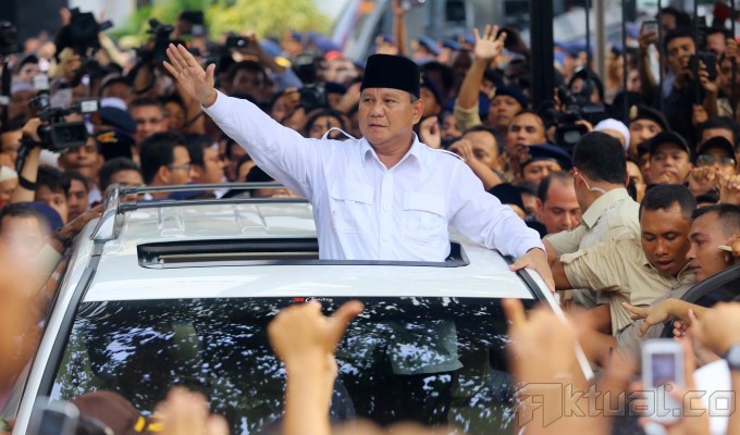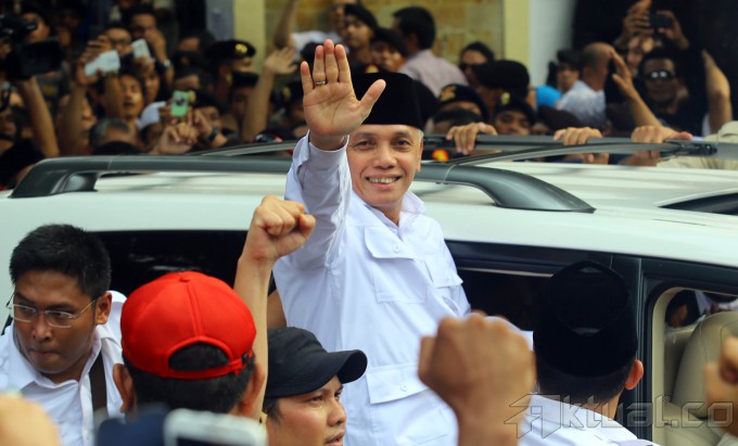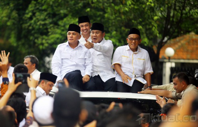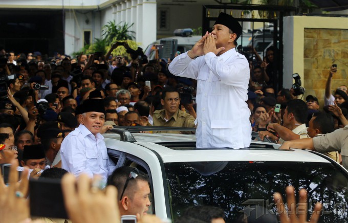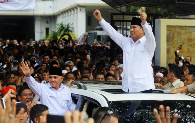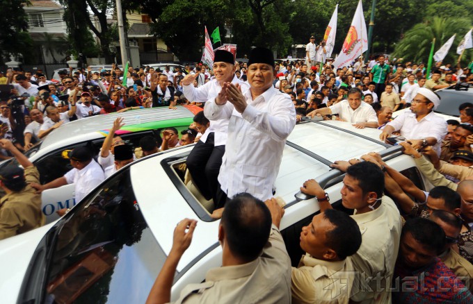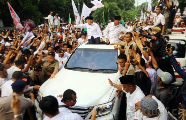 Pasangan Capres dan Cawapres, Prabowo Subianto dan Hatta Rajasa menyapa kader dan simpatisan diatas mobil seusai mendaftar untuk mengikuti Pilpres 2014 di Kantor KPU, Jakarta, Selasa (20/5/2014). Pasangan Prabowo Subianto-Hatta Rajasa didukung koalisi Partai Gerindra, PAN, PPP, Golkar, dan PBB. Aktual/Tino Oktaviano