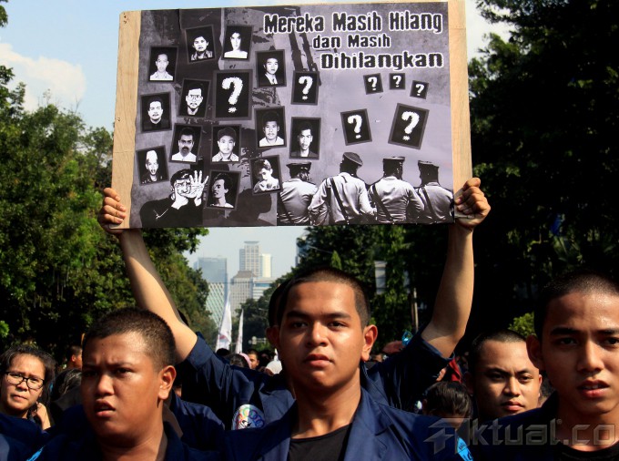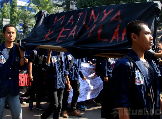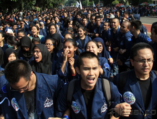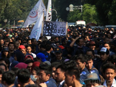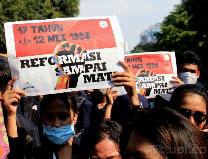 Ribuan mahasiswa Trisakti melakukan aksi di depan Istana Merdeka, Jakarta, Selasa (12/5/2015). Mahasiswa peringati 17 tahun penembakan 4 mahasiswa Trisakti 1998 dan menuntut Presiden Jokowi menyelesaikan kasus tersebut. AKTUAL/MUNZIR