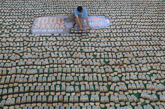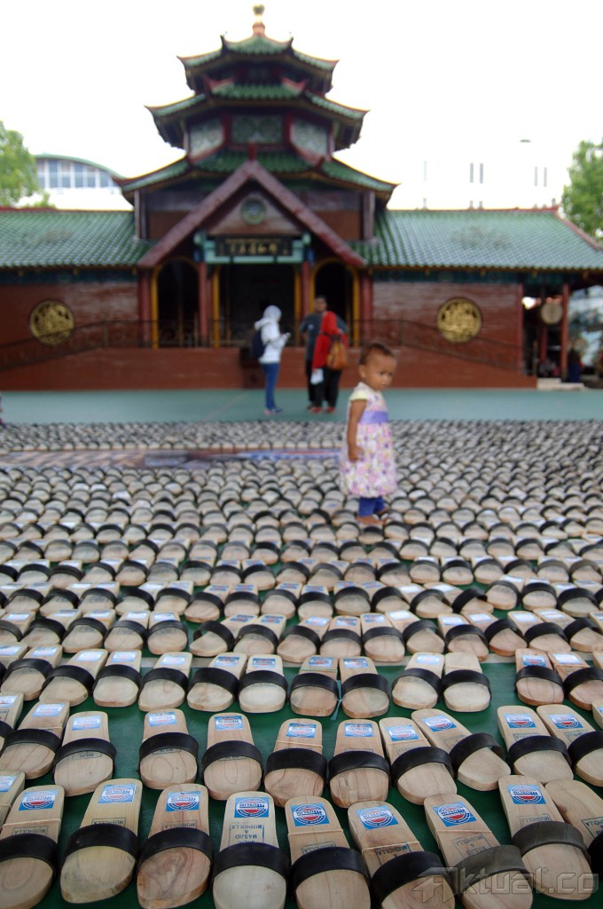 Seorang anggota komunitas menata sandal bakiak yang akan di distribusikan di Masjid Cheng Ho, jalan Gading, Surabaya, Minggu (1/2/2015). Komunitas Wirausaha Muslim meluncurkan program 1000 Bakiak untuk masjid, untuk wilayah Surabaya dan sekitarnya. ANTARA FOTO/M Risyal Hidayat