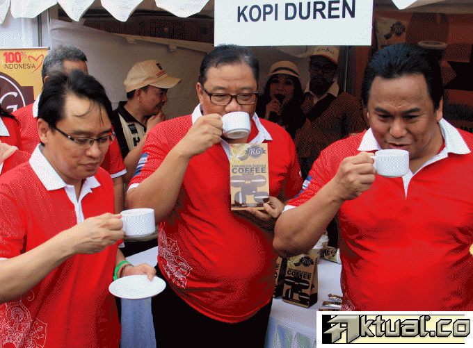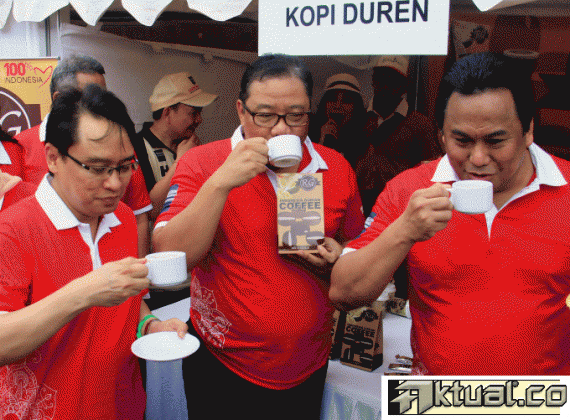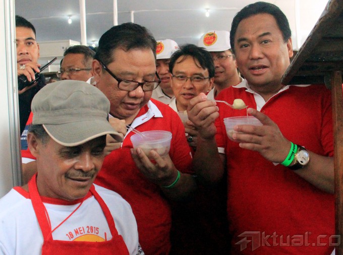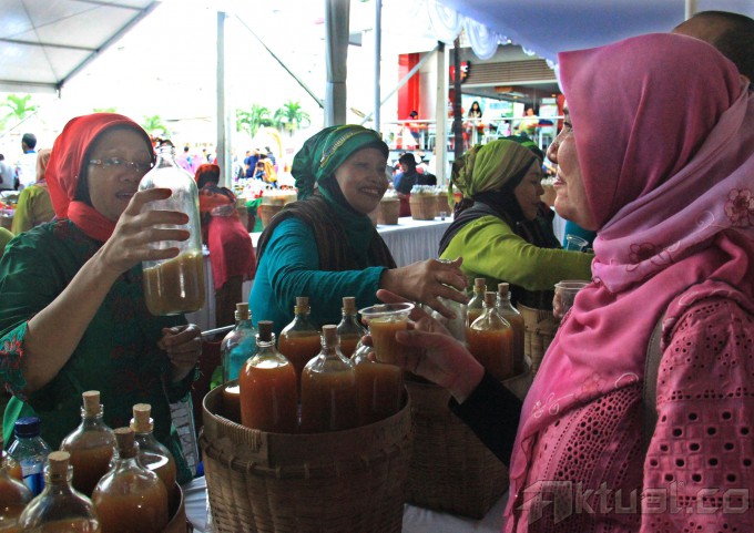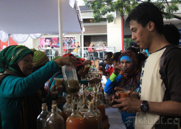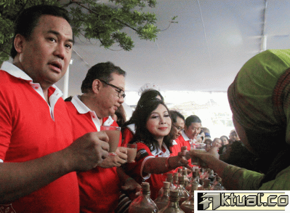 Menteri Perdagangan, Rachmat Gobel (kiri) dan Menteri Koperasi dan UMKM Anak Agung Gede Ngurah Puspayoga mencoba jamu yang dibagikan di kawasan Sarinah, Jakarta Pusat, Minggu (10/5/2015). Acara ini dalam rangka peringatan Hari Konsumen Nasional dan mengajak masyarakat minum gratis berbagai jamu tradisional, selain itu sekaligus melestarikan jamu sebagai minuman kesehatan tradisional khas Indonesia. AKTUAL/MUNZIR
