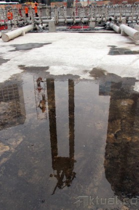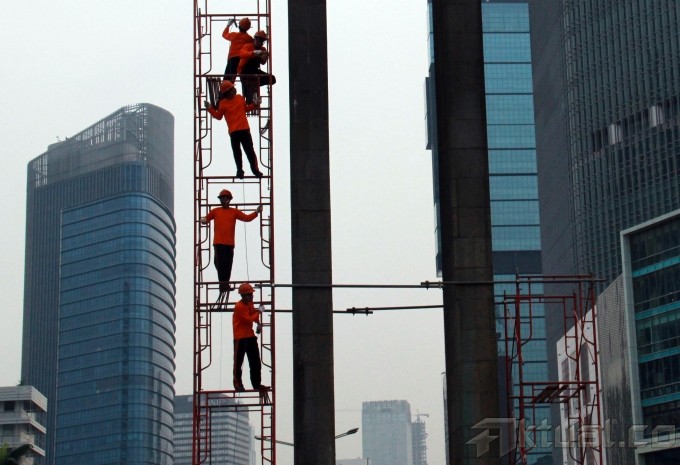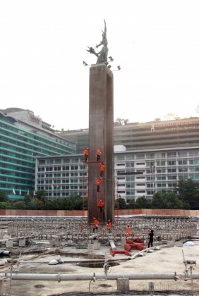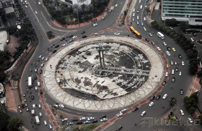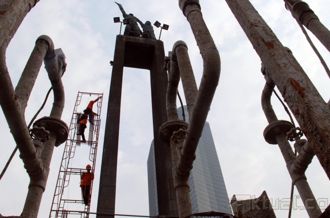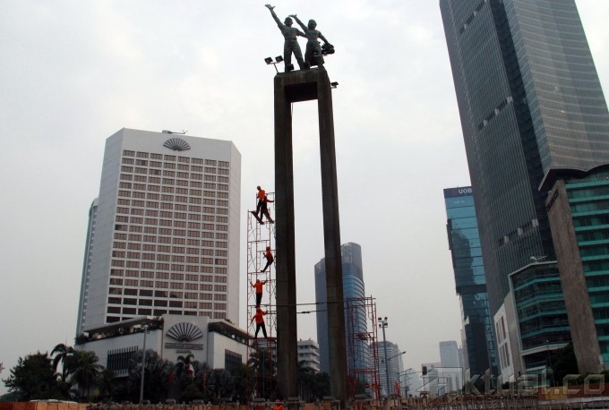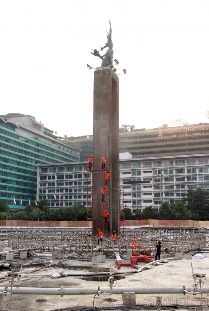 Pekerja menyelesaikan proyek perbaikan air mancur Bundaran Hotel Indonesia, Jakarta, Kamis (24/10/2013). Kolam tersebut dikeringkan untuk pekerjaan pembersihan, perbaikan pipa dan instalasi air mancur. Aktual/Tino Oktaviano
