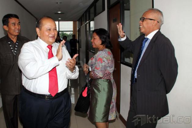 Sekjen PDIP Tjahyo Kumolo, saat bersama Terdakwa kasus dugaan penerimaan suap proyek Pembangkit Listrik Tenaga Uap (PLTU) Tarahan, Lampung, Emir Moeis saat berada diruang tunggu pengadilan Tipikor, Jakarta, Kamis (28/11/2013). Emir akan menjalani sidang perdana atas kasus dugaan penerimaan suap proyek pembangkit listrik tenaga uap PLTU Tarahan. Ia dijerat dalam kapasitasnya sebagai anggota DPR 1999-2004 dan 2004-2009, karena diduga menerima 300.000 dollar AS dari PT Alstom Indonesia yang merupakan perusahaan pemenang tender PLTU Tarahan. Aktual/Tino Oktaviano
