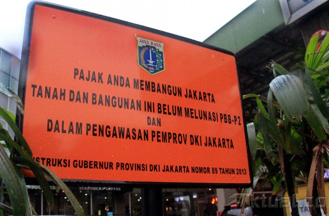 Spanduk peringatan dari pajak dari Pemprov DKI terpasang di Mal Tebet Green jalan Letjen MT Haryono, Jakarta, Kamis (22/1/2015). Mal Tebet Green disegel oleh petugas karena menunggak membayar pajak selama 4 tahun sebanyak Rp 1,8 miliar. Selain itu Mal tersebut juga dibangun di atas tanah Kostrad seluas 7.475 meter atas kerja sama Yayasan Kostrad Darmaputra dengan PT Wahana Cipta Sentosa Sejahtera. AKTUAL/MUNZIR