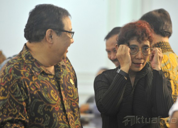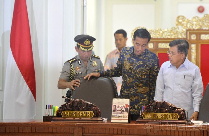 Presiden Joko Widodo (kedua kanan) berbincang dengan Wapres Jusuf Kalla (kanan) sebelum memimpin jalannya sidang kabinet paripurna di Kantor Presiden, Jakarta, Senin (30/3). Tiga agenda pertemuan tersebut yakni membahas kenaikan harga bahan pokok, situasi terkini bidang polhukam, dan hasil kunjungan kerja Presiden Joko Widodo ke Jepang dan Tiongkok. ANTARA FOTO/Andika Wahyu