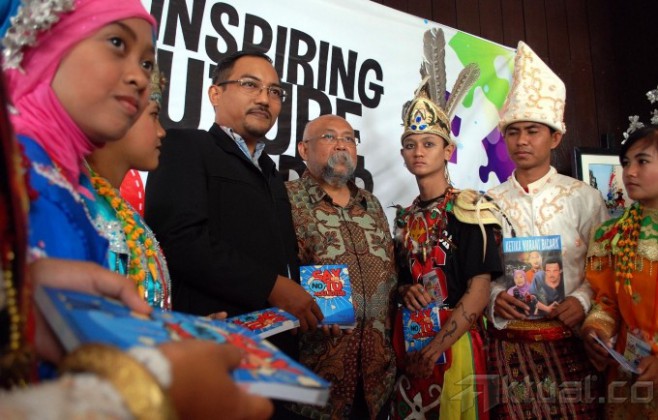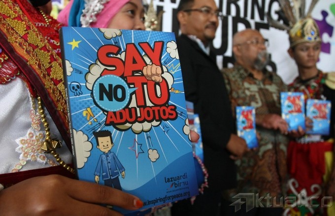 Buku berjudul “Say No To Adu Jotos” diperkenalkan kepada sejumlah pelajar SLTA se-Indonesia peserta youth training lazuardi birru di Jakarta, Kamis (5/9). pelatihan yang diikuti 500 pelajar SLTA se Indonesia ini bertujuan untuk mengajak pelajar seluruh Indonesia untuk bisa menjadi pemimpin masa depan yang mempunyai jiwa nasionalisme tinggi dan dapat mecegah bibit radikalisme. Aktual/Tino Oktaviano